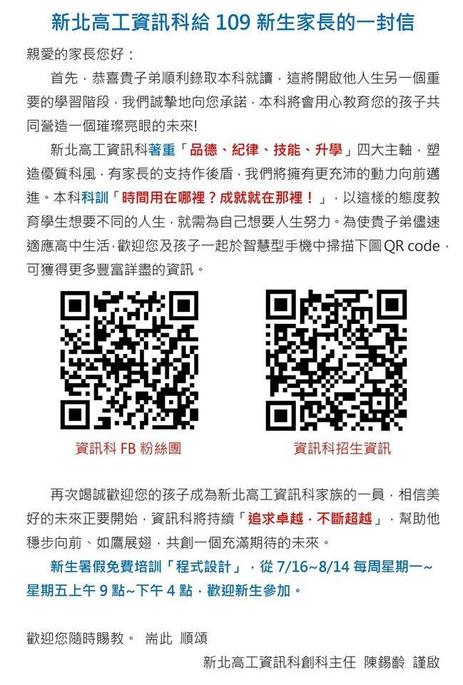 資訊科:109學年度寫給新生與家長1封信