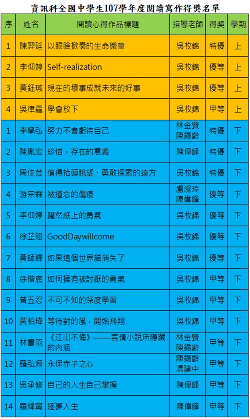資訊科:全國中學生107學年度閱讀心得寫作榮獲佳績