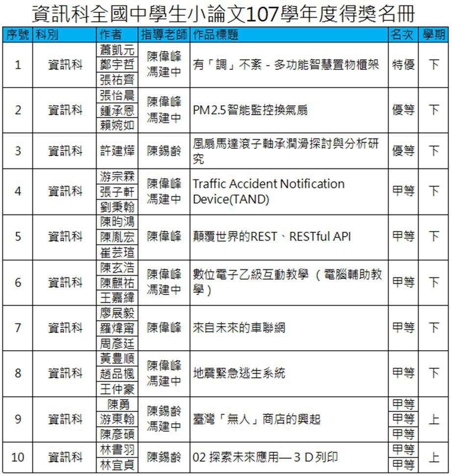 資訊科:全國中學生107學年度小論文競賽榮獲佳績