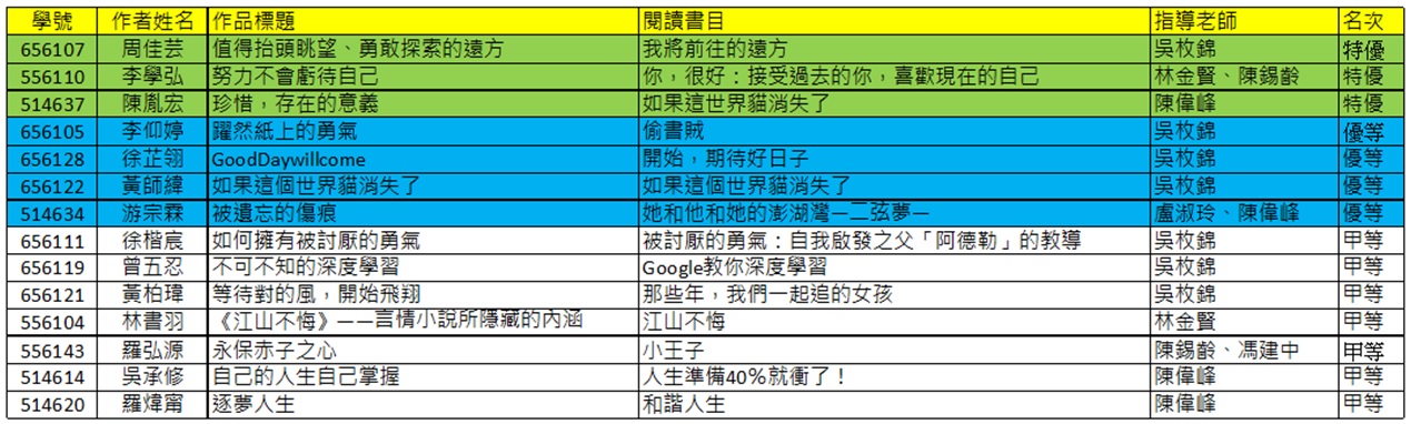 資訊科107全國高級中等學校閱讀心得寫作比賽3特優 4優等 7甲等