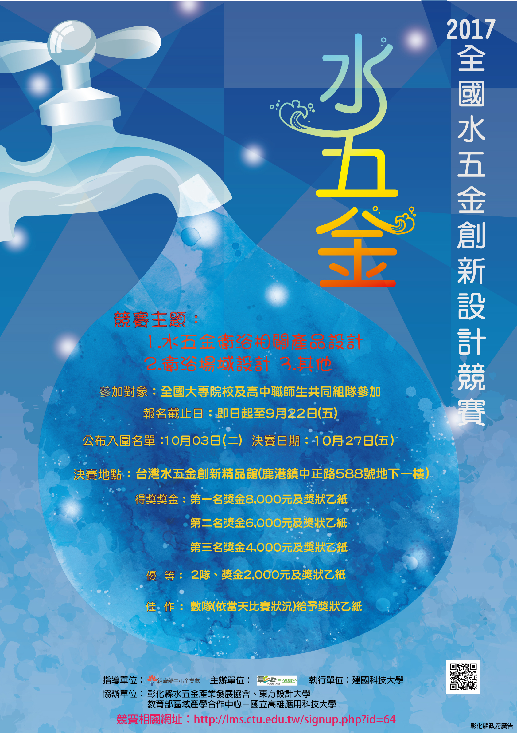 一、為鼓勵我國大專校院學生投入傳統產業之創新設計,並提升學生實務應用及創新創意能力,本中心與建國科技大學、東方設計大學共同舉辦「2017全國水五金創新設計競賽」,透過設計競賽及觀摩學習促進技術交流及實務學習成長。 (一)競賽日期:106年10月27日(星期五)。 (二)競賽地點:臺灣水五金創新精品館地下一樓(彰化縣鹿港鎮中正路588號)。 (三)競賽主題:1.水五金衛浴相關產品創新設計2.衛浴場域創新設計3.其他。 (四)參賽對象:全國技專院校及高中職師生組隊參加。 (五)報名日期:即日起至9月22日下午5時止。 (六)網路報名:請先至活動專屬網站報名http://lms.ctu.edu.tw/signup.php?id=64。 (七)聯絡窗口:傅凱琳小姐,TEL:04-711-1111#3501,Email:kaylin@ctu.edu.tw。 二、檢送活動簡章及海報如附件。