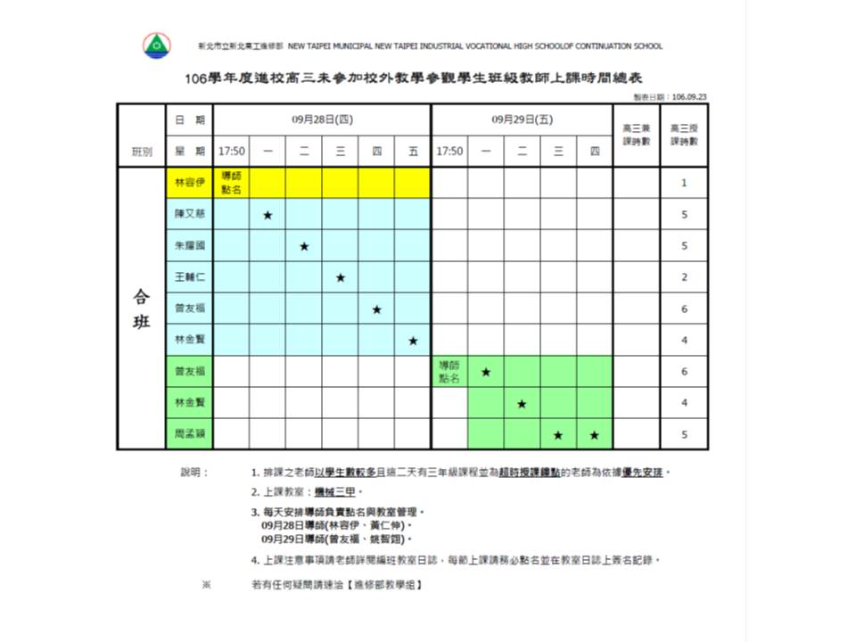 **公告進修部高三未參加校外教學學生09/28~09/29在校上課編班及注意事項**