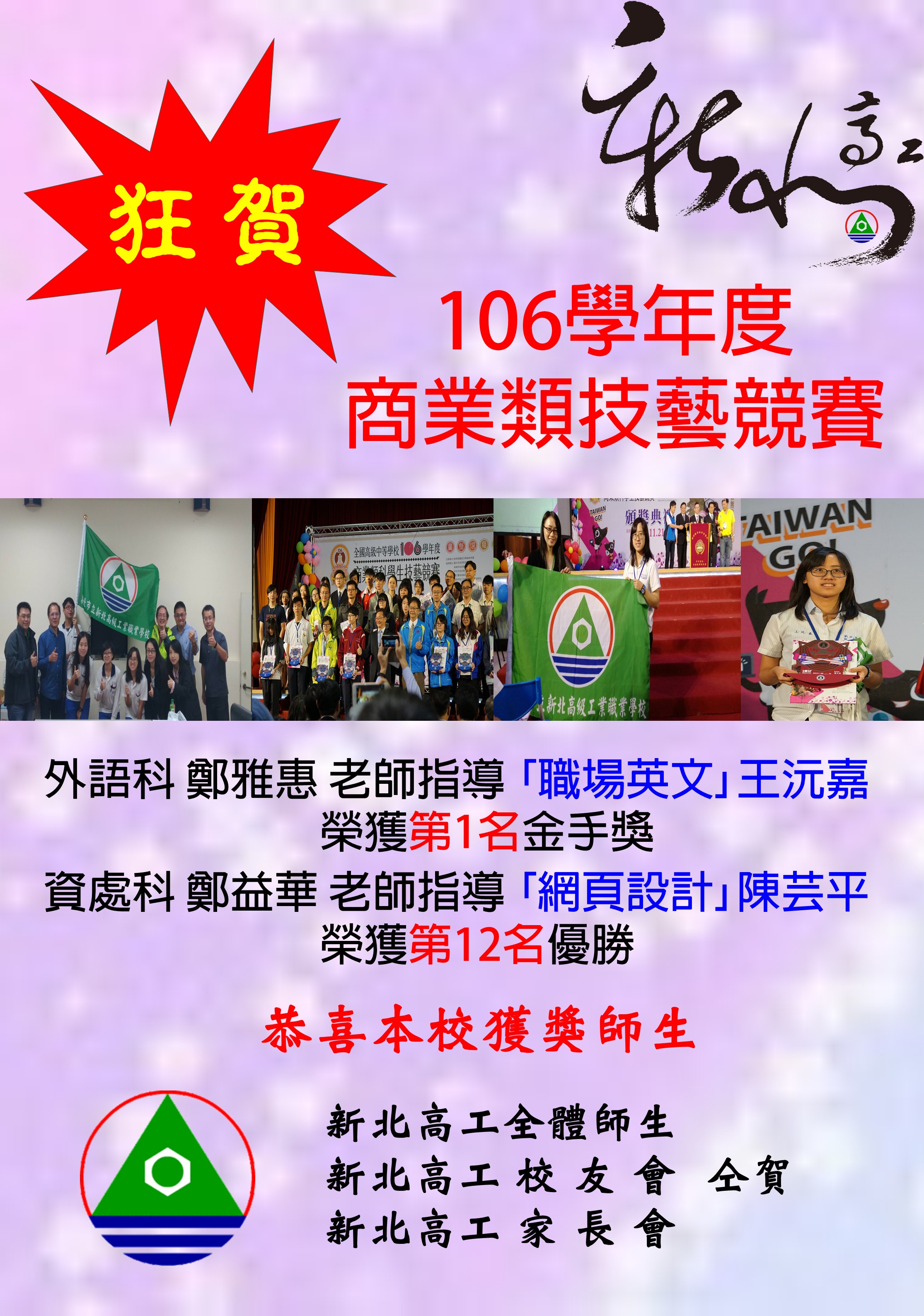 恭賀 本校參與106學年度商業類技藝競賽榮獲第1名金手獎與優勝