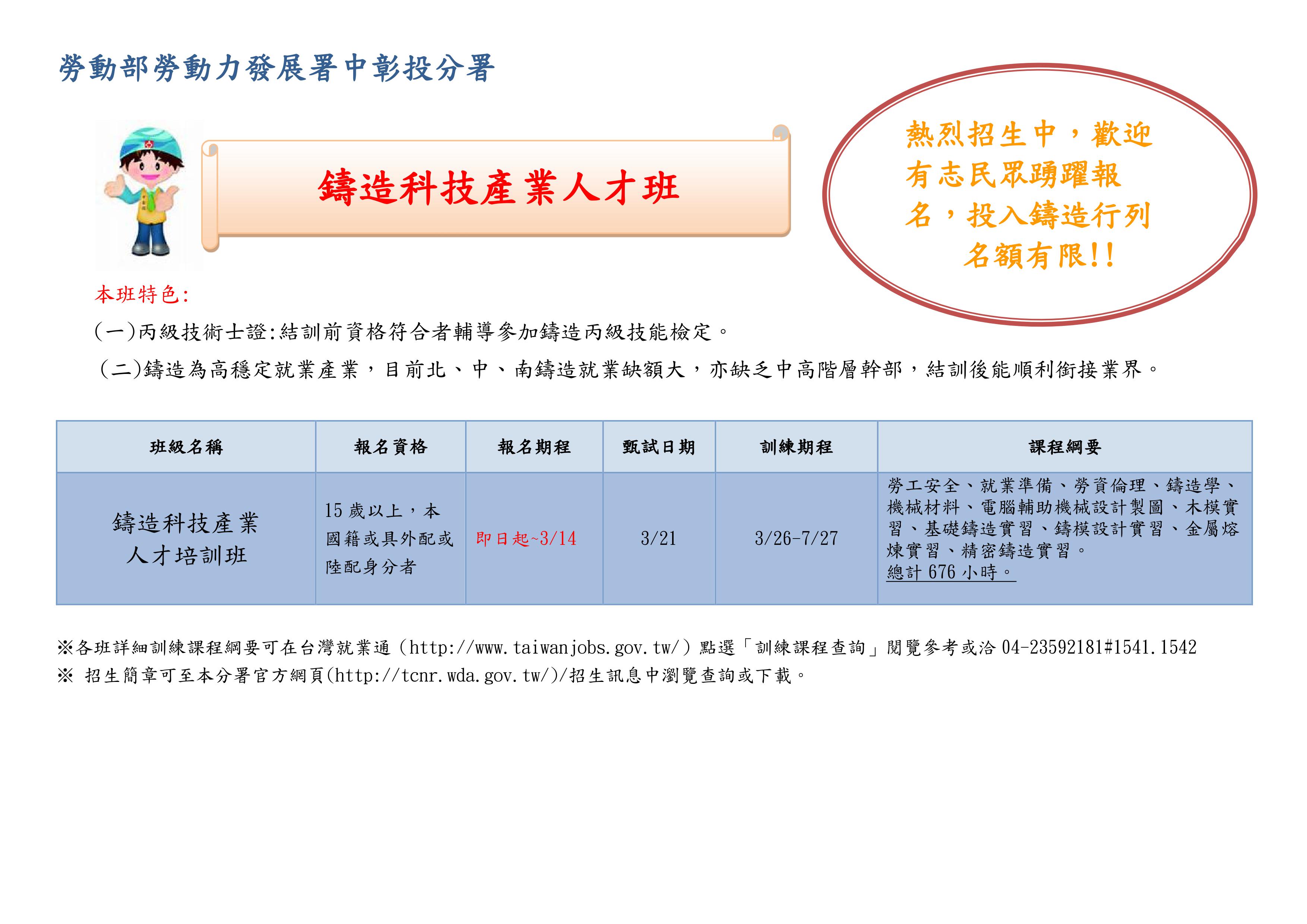 轉知勞動部辦理「鑄造科技產業人才培訓班」招訓簡章及宣導單各1份