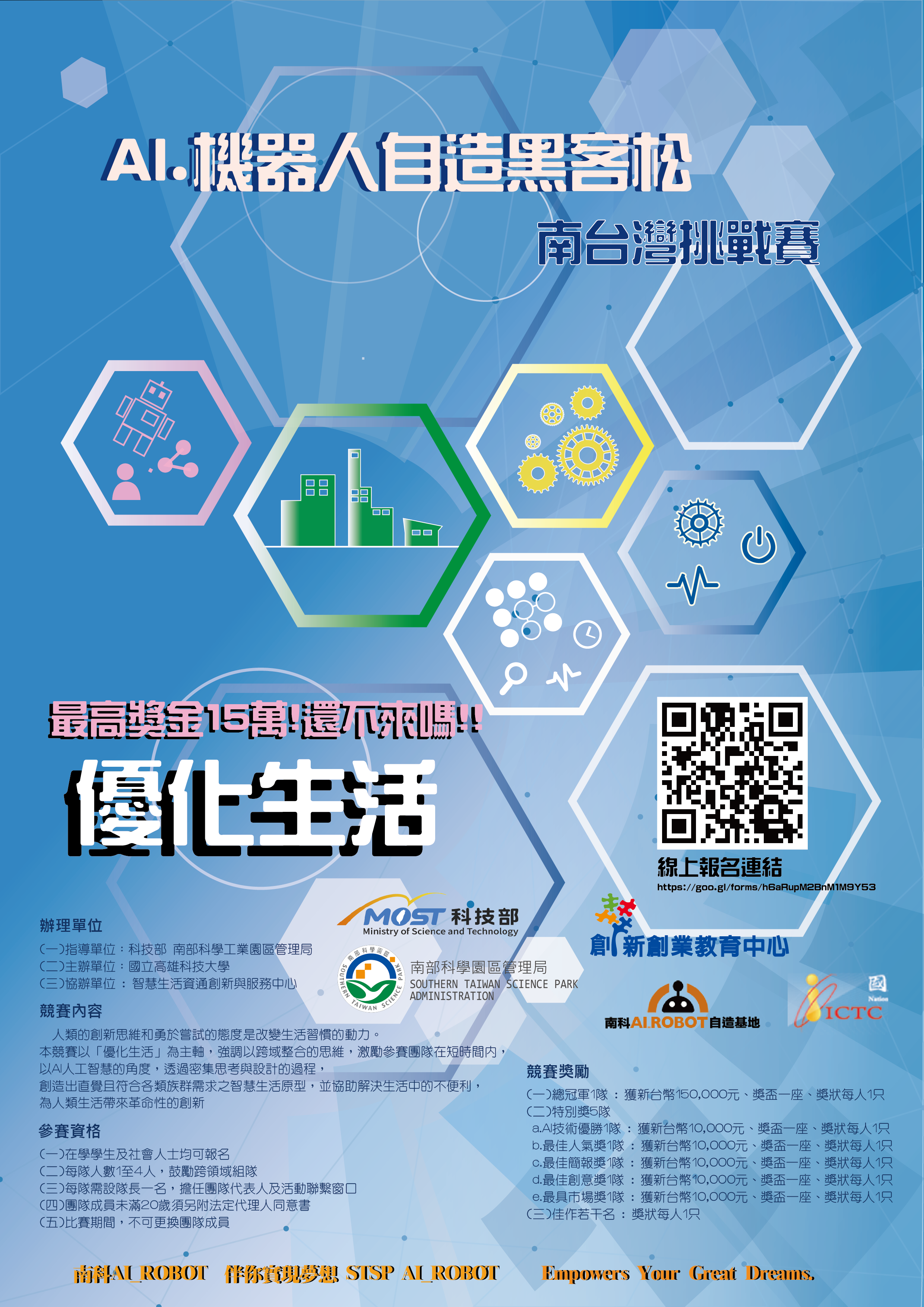 [轉知]高雄科技大學校與科技部AI_ROBOT自造基地共同辦理「2018_AI機器人自造黑客松:南台灣挑戰賽」,歡迎師生踴躍報名。