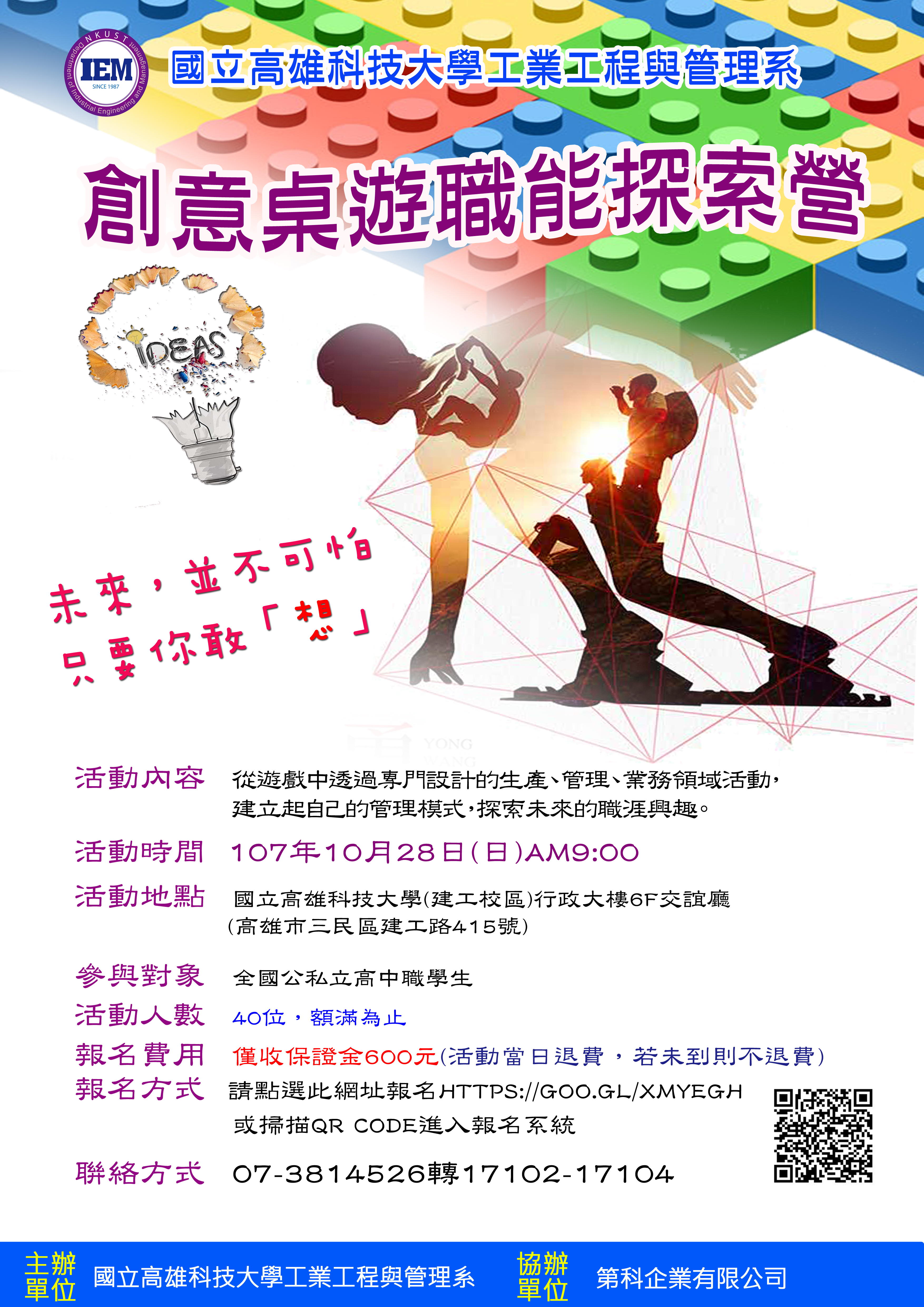 國立高雄科技大學工業工程與管理系舉辦「創意桌遊職能探索營」,活動海報如附件,敬請踴躍報名參加。