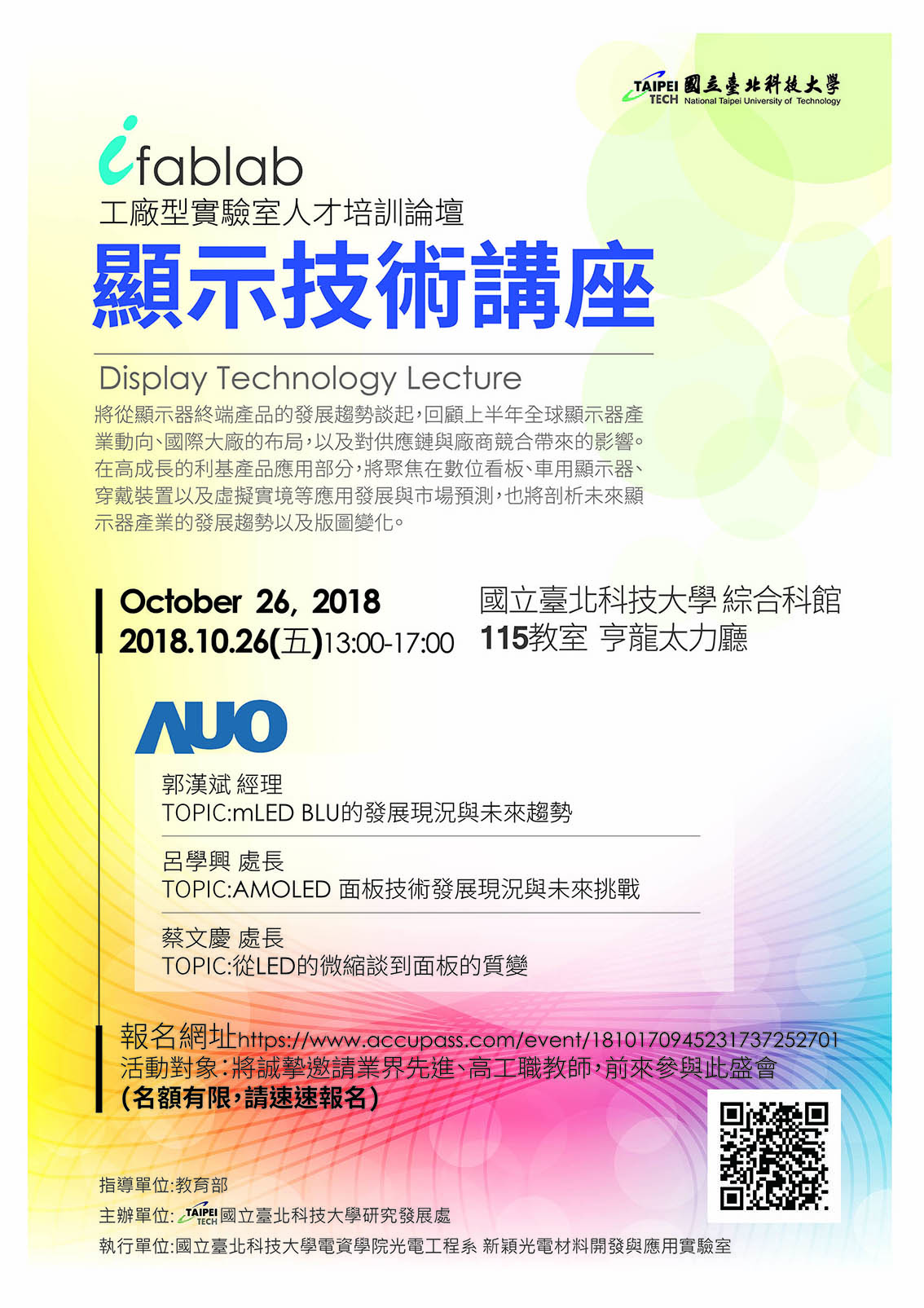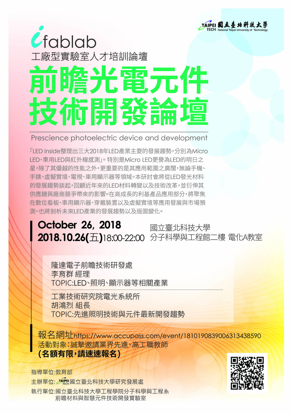 一、107年10月26日,假國立臺北科技大學辦理「107年度工廠型實驗室產業核心技術人才培訓」論壇,共2場,敬請高中職教師踴躍報名參加。