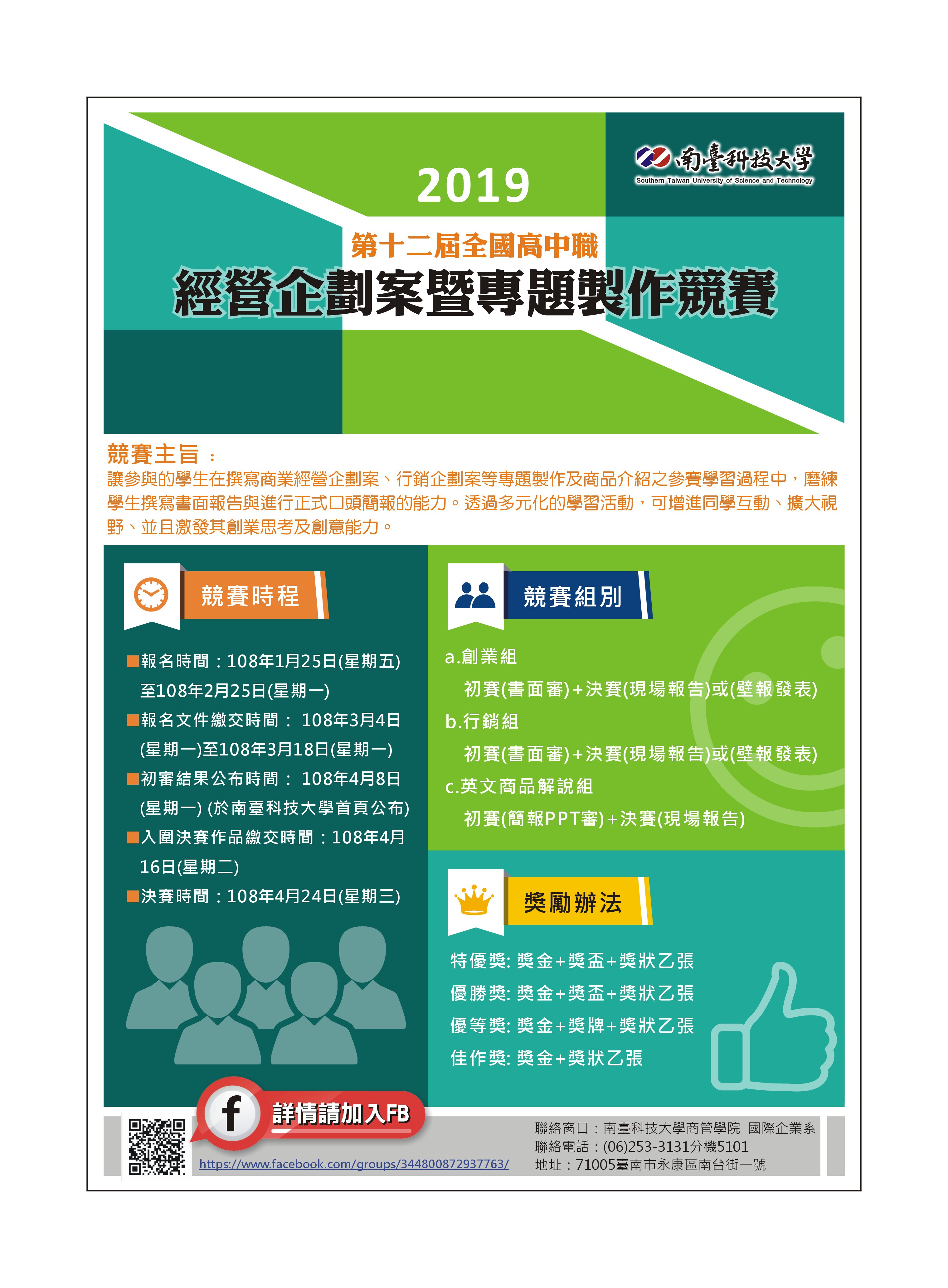 一、本競賽活動為教育部「高教深耕計畫」之分項計畫活動,歡迎全國高中職學生組隊報名參加。 二、所附2019第十二屆全國高中職經營企劃案暨專題製作競賽簡章及活動海報,敬請惠予公告。 三、聯絡人:國際企業系高瑞媜助教;電話:(06)253-3131轉5101;傳真電話:(06)254-4363。 四、競賽辦法及報名表:請至本校商管學院下載,網址:http://business.stust.edu.tw/tc/node/Proposal。