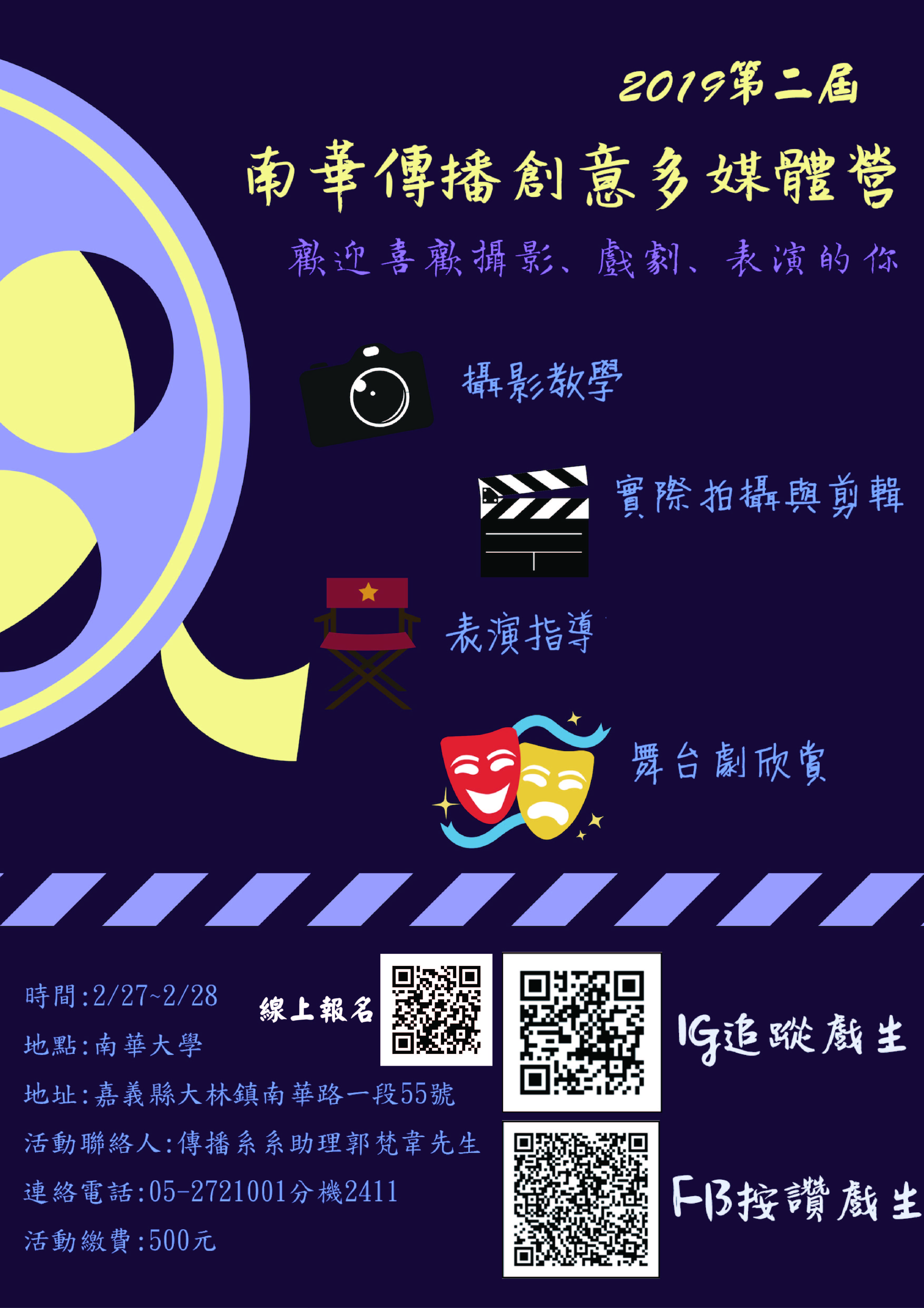 一、為提升高中職學生網路影音創作能力、戲劇表演能能力,舉辦2019南華傳播創意多媒體營,活動資訊如附件。 二、參與資訊: 日期:108年2月27日(三)至28日(四)。 對象:全國高中職學生,以高三學生優先,限額40名,額滿截止。 活動繳費:500元整; 匯款帳戶:(郵局700)0301315-0056249(林宛璇小姐)。 報名網址:https://goo.gl/forms/VauSknOxyY3HrS4g2。 相關資訊請參考南華大學傳播系官網:http://media.nhu.edu.tw/ 三、活動聯繫人:傳播系系助理郭梵韋先生電話05-2721001分機2411電子信箱:ted79501@nhu.edu.tw