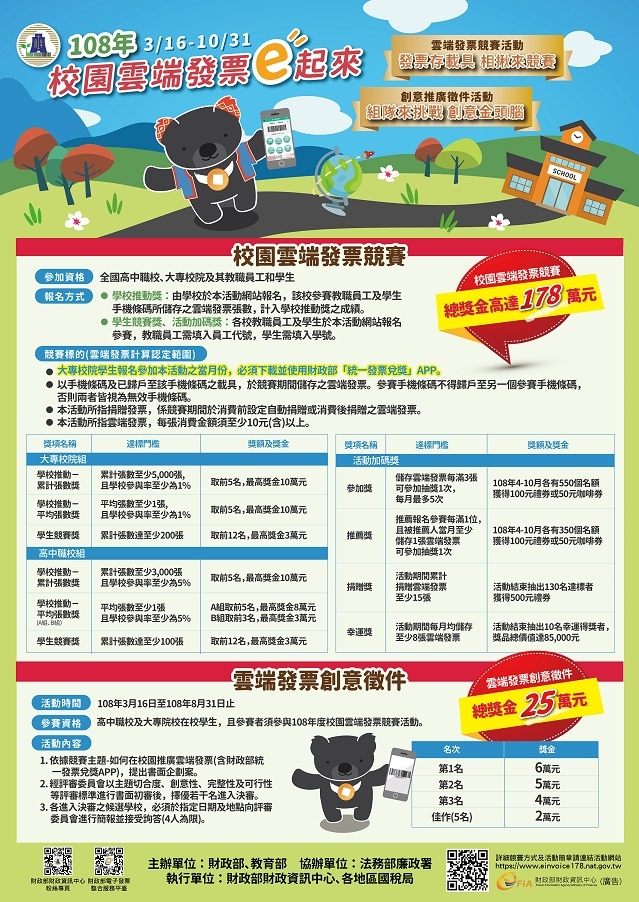 一、依據財政部「108年度校園雲端發票競賽」活動簡章、財政部北區國稅局「108年度推行租稅教育及宣導工作計畫」、「108年度結合統一發票推行辦理地區性租稅教育及宣導執行計畫」暨本分局「108年度推行租稅教育工作計畫」辦理。 二、本競賽活動對象及報名方式: (一)對象:全國高中職校、大專校院及其教職員工和學生(含競賽期間退休、畢業者)。 (二)報名方式:於本活動網站(https://www.einvoice178.nat.gov.tw)報名。 三、檢附「108年度校園雲端發票競賽」活動簡章及宣傳海報各1份。