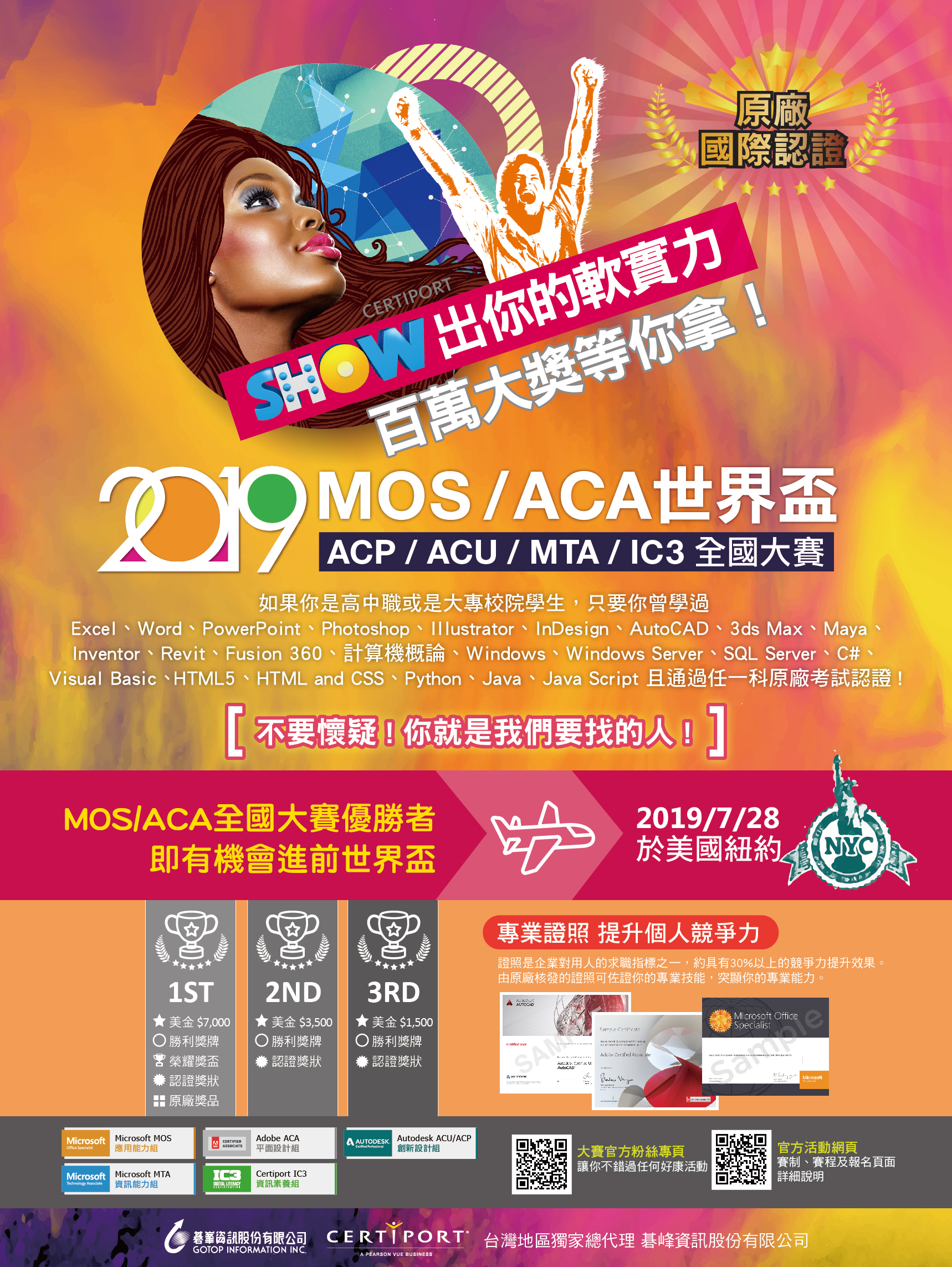 一、本年度「Microsoft MOS / Adobe ACA全國大賽」活動業已開跑,為期能鼓勵更多學生參與,發揮自身所學,展現其專業能力,本競賽兩大組別特色分述如下: (一)「Microsoft MOS全國大賽」係結合微軟Office各項軟體技能,以商務資訊應用領域之技術能力作為競賽評比項目 (二)「Adobe ACA全國大賽」著眼於創意與設計實作能力,競賽評比項目為切合主題意象之平面設計作品 二、競賽內容、報名時間及方式: (一)報名時間:即日起至2019年5月10日報名截止 (二)報名方式:採線上報名,全程免收取報名費用 (三)活動賽制:初賽分北/中/南三區舉辦,全國總決賽將於2019年6月16日假國立臺北商業大學舉辦 (四)台灣選手代表權:於全國大賽總決賽脫穎而出的Microsoft MOS與Adobe ACA組選手,將有機會受本公司推薦為台灣代表,代表我國參加「2019 Microsoft MOS / Adobe ACA World Championship世界盃競賽」 三、「2019 Microsoft MOS / Adobe ACA World Championship世界盃競賽」係由全球最知名科技巨擘Microsoft、Adobe與IT專業認證服務商Pearson VUE/Certiport主辦,去年共有來自116個國家,超過760,000名選手參與本國際賽事,角逐世界冠軍寶座。 四、本年度世界盃賽事將於2019/07/28 2019/07/31假美國紐約市舉辦全球總決賽,世界盃各競賽科目冠軍獎金為美金7,000元、亞軍獎金為美金3,500元、季軍獎金為美金1,500元。 五、我國學子軟實力堅強,歷年賽事皆表現優異,屢次榮獲世界盃競賽佳績,去年「Microsoft MOS世界盃競賽」即由我國選手分別取得冠軍、季軍殊榮,成績斐然為國爭光。 六、鑑請 貴校於商業、資訊及設計相關科系廣為宣導,並惠予轉知相關授課教師,鼓勵同學積極參與,於推動資訊教育,強化學子就業競爭力亦有相當助益,並可彰顯 貴校辦學成績之優異,對提升校譽及促進校務發展皆具有正面效益。 七、針對2019 Microsoft MOS / Adobe ACA全國大賽暨世界盃競賽,將於近日辦理各區域研習會,活動資訊詳見下列網址,鑑請 貴校惠予指派相關教學人員參加。 Microsoft MOS報名網址|http://bit.ly/2019_MOS Adobe ACA報名網址|http://bit.ly/2019_ACA 八、其他未盡事宜以網站公告資訊為準,最新訊息及賽制規則敬請參考大會網站:http://championship.gotop.com.tw