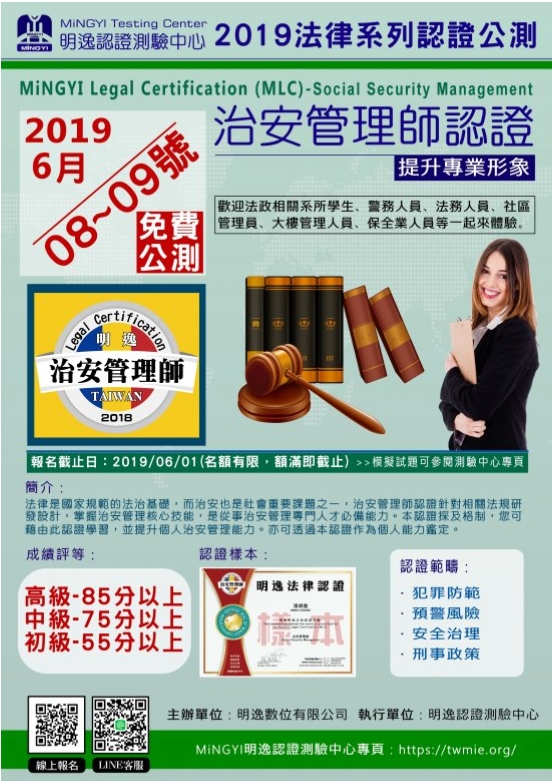 一、法律是國家規範的法治基礎,而治安也是社會重要課題之一,治安管理師認證針對相關法規研發設計,掌握治安管理核心技能,是從事治安管理專門人才必備能力。本認證採及格制,您可藉由此認證學習,並提升個人治安管理能力。亦可透過本認證作為個人能力鑑定。 二、認證科目:治安管理師認證。 三、測驗題數:50題。 四、測驗時間:50分鐘。 五、報名日期:即日起至2019/06/01止。 六、測驗期間:2019/06/08至2019/06/09。 七、認證範疇:犯罪防範、預警風險、安全治理及刑事政策。 八、關於活動詳細辦法與注意事項,請參閱「MiNGYI-明逸認證測驗中心」->「公測活動」(測驗中心網址:https://twmie.org/)。 九、若有任何疑問請透過以下資訊與我們聯絡。服務電話:0908108081,服務信箱:testing@twmie.org或加入明逸Line官方認證客服:@rzu4900o,同時掌握最新資訊。 十、本文附件宣傳海報(如附件1),敬邀貴校師生免費報名認證體驗考。
