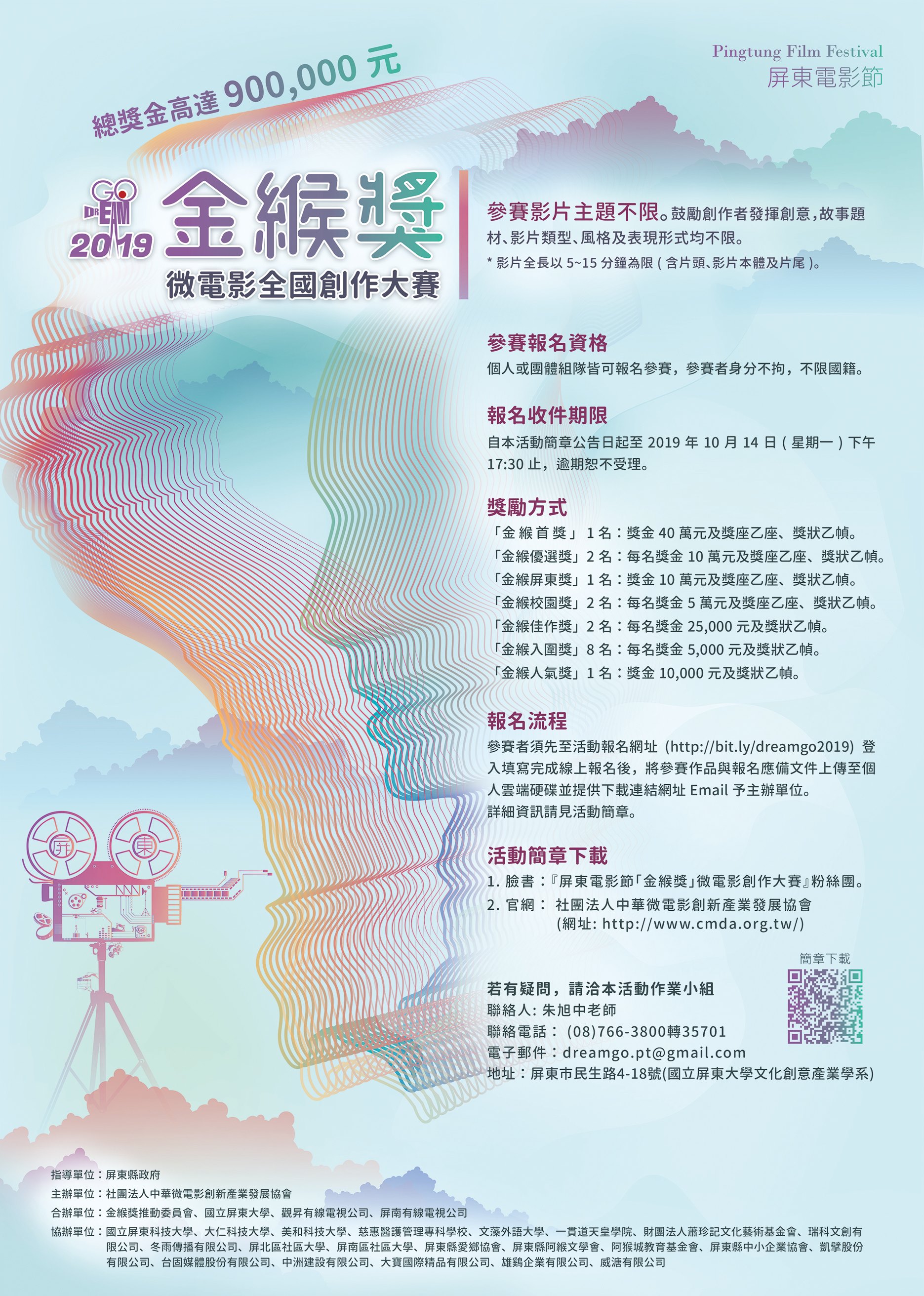轉知:為鼓勵國內校園影音人才,發揮學生製片創意性之精神,國立屏東大學與社團法人中華微電影創新產業發展協會辦理「2019屏東電影節第八屆金緱獎微電影全國創作大賽」活動。