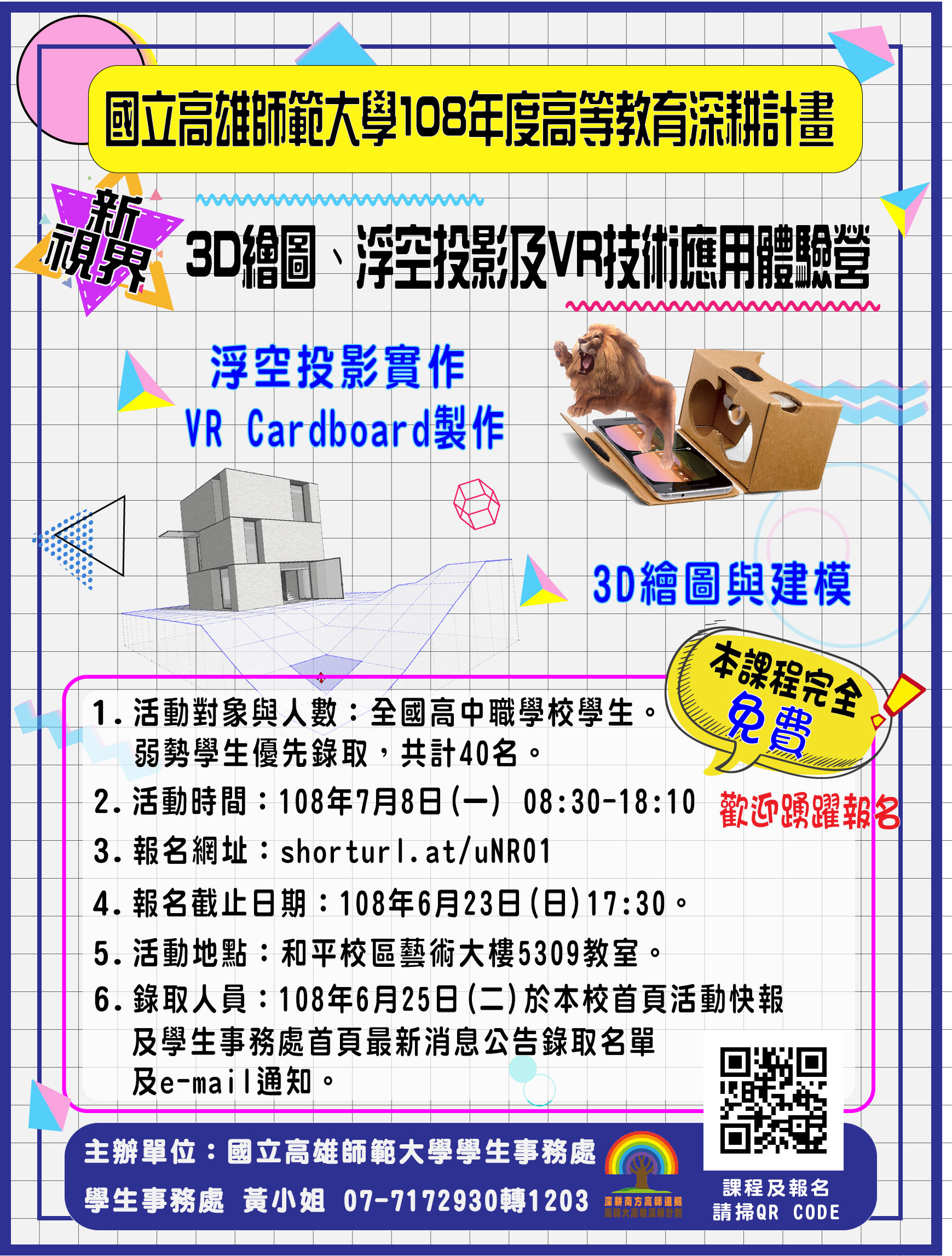 轉知:國立高雄師範大學辦理108年度「新視界-3D繪圖、浮空投影及VR技術應用體驗營」實施計畫及海報各1份