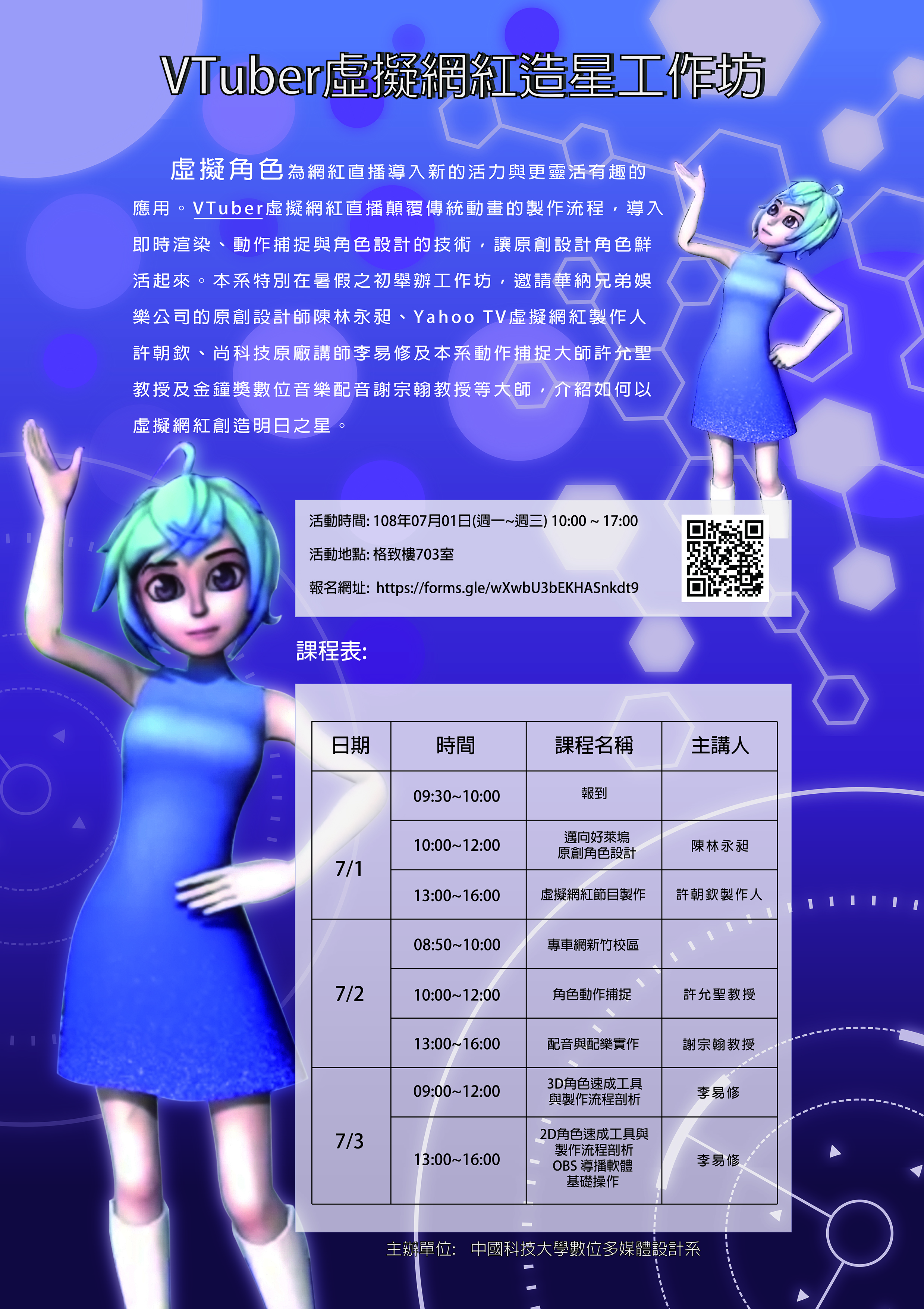 一、本校舉辦之「VTuber虛擬網紅造星工作坊」活動,顛覆傳統動畫的製作流程,導入即時渲染、動作捕捉與角色設計的技術,為網紅直播導入新的活力與更靈活有趣的應用,敬請貴校同學踴躍參加。