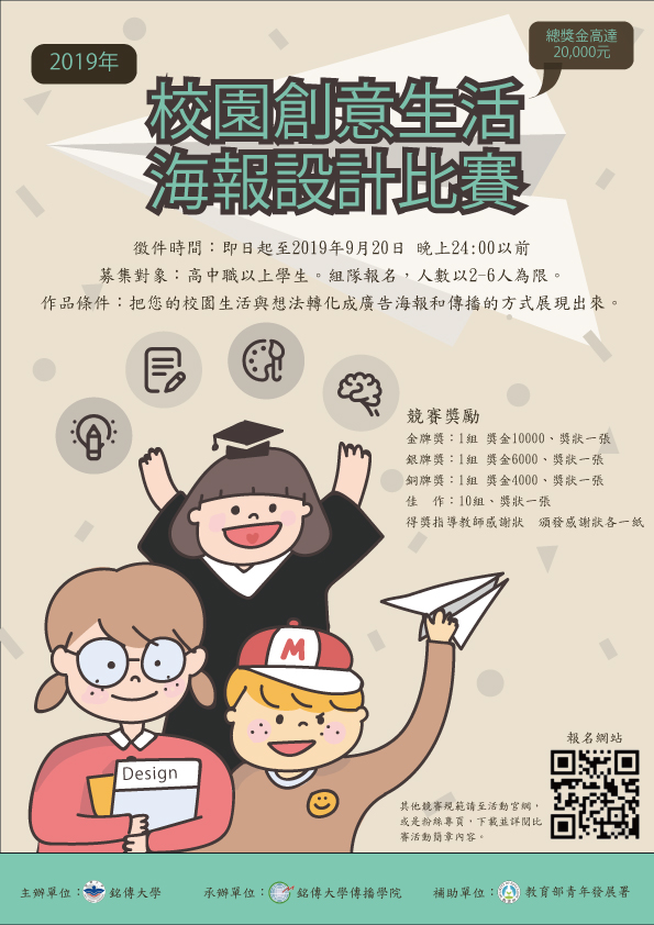 一、為鼓勵國內壆子海報藝術創作素養,及形塑校園生活特色,本校傳播學院特舉辦「2019校園創意生活海報設計比賽」,開放高中(職)以上學生組隊參賽,本競賽預計於9月20日24時截止報名。 二、本屆比賽主題為「校園生活」,請有意投件參賽者以此為主題發想創作,最高獎金新台幣一萬元,凡報名時具我國公私立高中(職)學歷之學生(含大學、碩博士班),不限國籍,皆可參加。 三、詳細辦法與報名表,請參考比賽網站(http://120.96.128.167/)。 四、檢附比賽海報與報名電子檔各一份,敬請貴校協助宣傳。