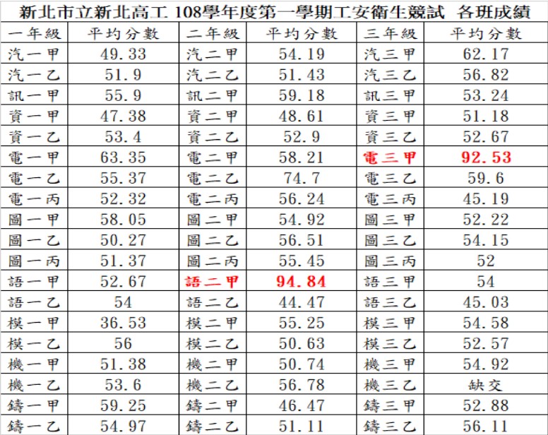 新北市立新北高工 108學年度第一學期工安衛生競試 各班成績公告