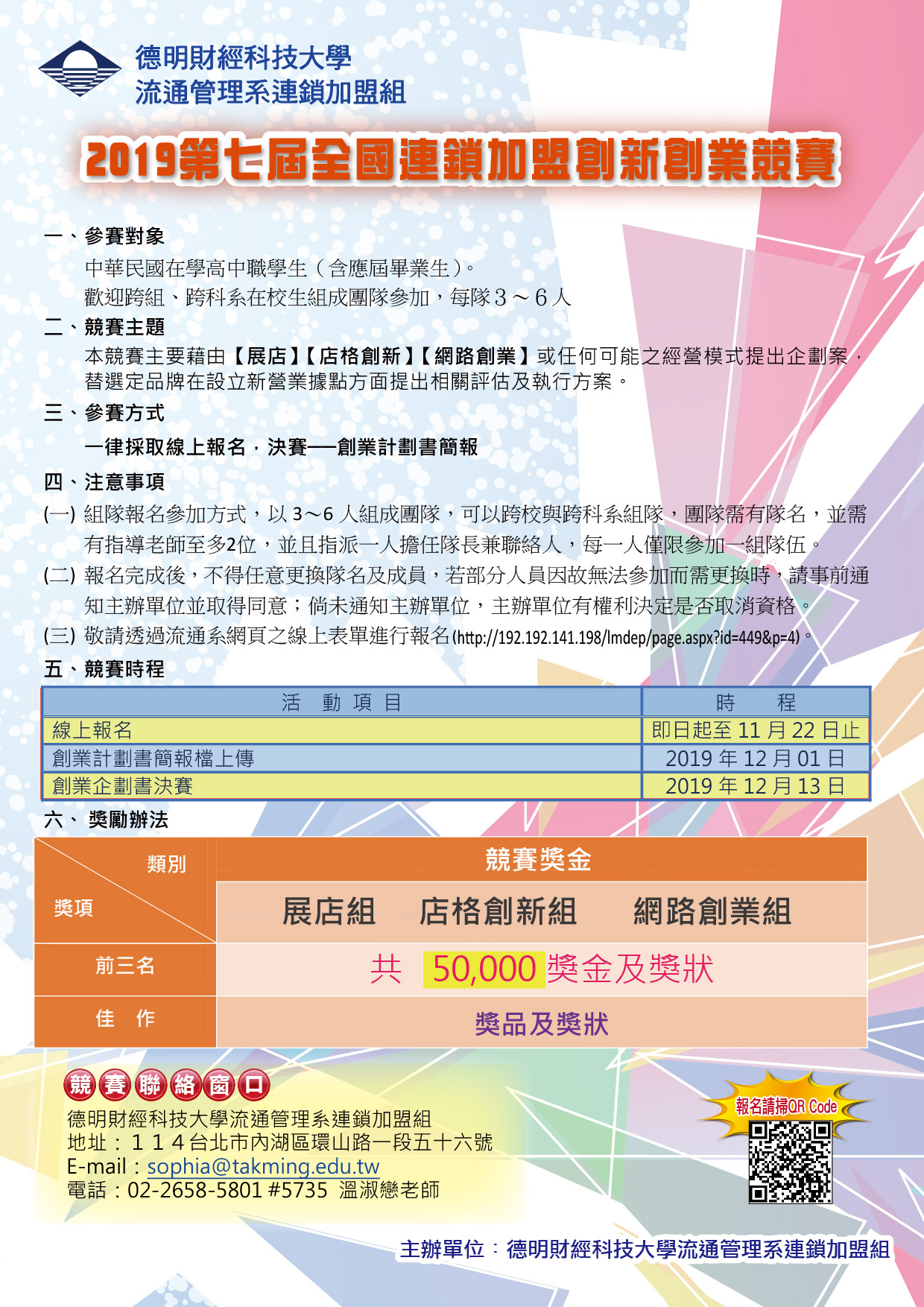 轉知:德明財經科技大學舉辦第七屆全國連鎖加盟創新創業競賽。
