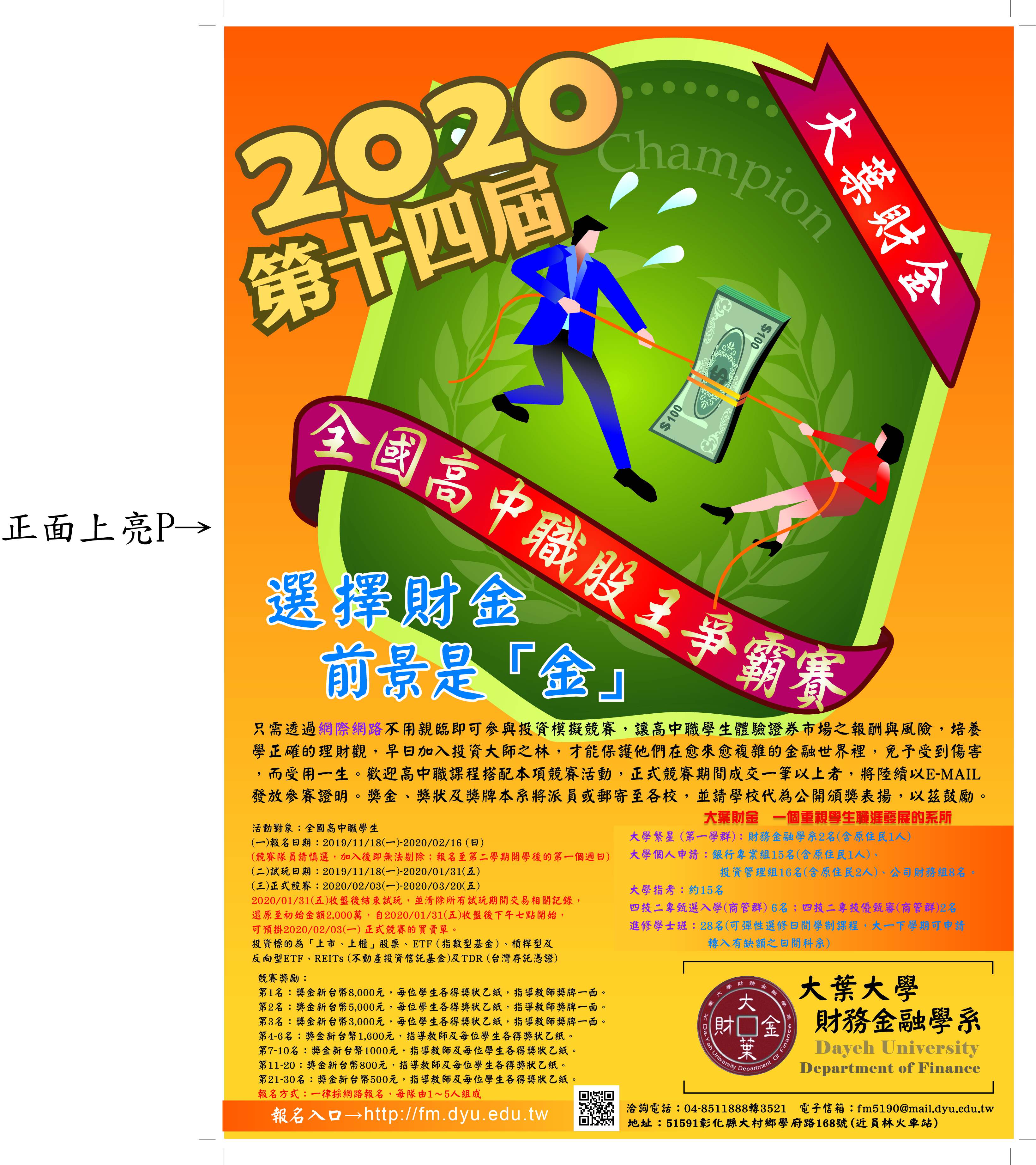 一、本校管理學院財務金融學系謹訂於108年11月18日至109年3月20日舉辦「2020第十四屆大葉財金全國高中職股王爭霸賽」,本競賽活動每屆皆吸引超過150個高中職學校參加,參賽的學生數亦達4000人以上,是國內極具規模之大型競賽活動之一。 二、本競賽活動之交易規則與真實市場相同,競賽初始之本金為 NT$2000萬元,參賽者可透過建構投資組合的方式,學習如何規避風險、尋求合理的報酬,以體驗真實市場的運作,達到學用合一之目的。只需透過網際網路不用親臨,即可參與投資模擬競賽,讓高中職同學體驗證券市場運作可能面臨的風險與報酬,培養同學正確的理財觀,歡迎高中職課程搭配本競賽活動。 三、為提供甄試入學書面審查佐證資料之用,於正式競賽期間,若符合資格者,則以E-MAIL寄出參賽證明,前30名之名次證明電子檔於109年03月27日下午六點前以E-MAIL寄出。另,前30名名次證明書與獎金,則隨後陸續寄至各得獎學生的就讀學校,由學校校方代為頒發或由本系派員前往頒發。 四、活動期間: (一)報名期間:108年11月18日(一)至109年02月16日(競賽隊員請慎選,加入後即無法剔除;報名至第二學期開學後的第一個週日)。 (二)試玩期間:108年11月18日(一)至109年01月31日(五)。 (三)正式競賽:109年02月03日(一)至109年03月20日(五)。 五、報名對象:全國高中職學生(每隊可由1至5人組成)。 六、更多活動詳情,請參見大葉大學財務金融學系官網( https://fm.dyu.edu.tw/ 頁面右上方:2020第十四屆大葉財金全國高中職股王爭霸賽)。 ![]() ![]() 瀏覽數