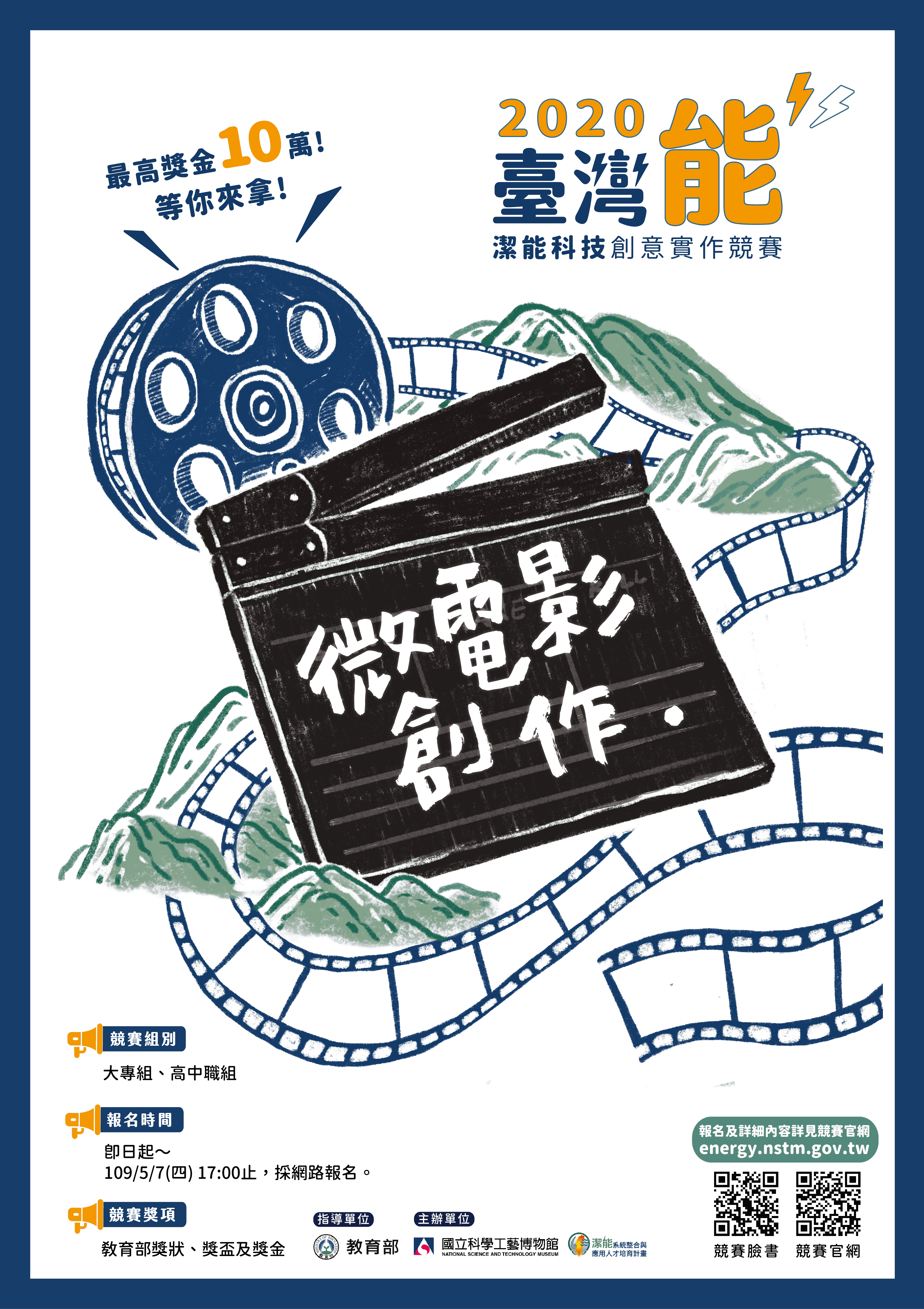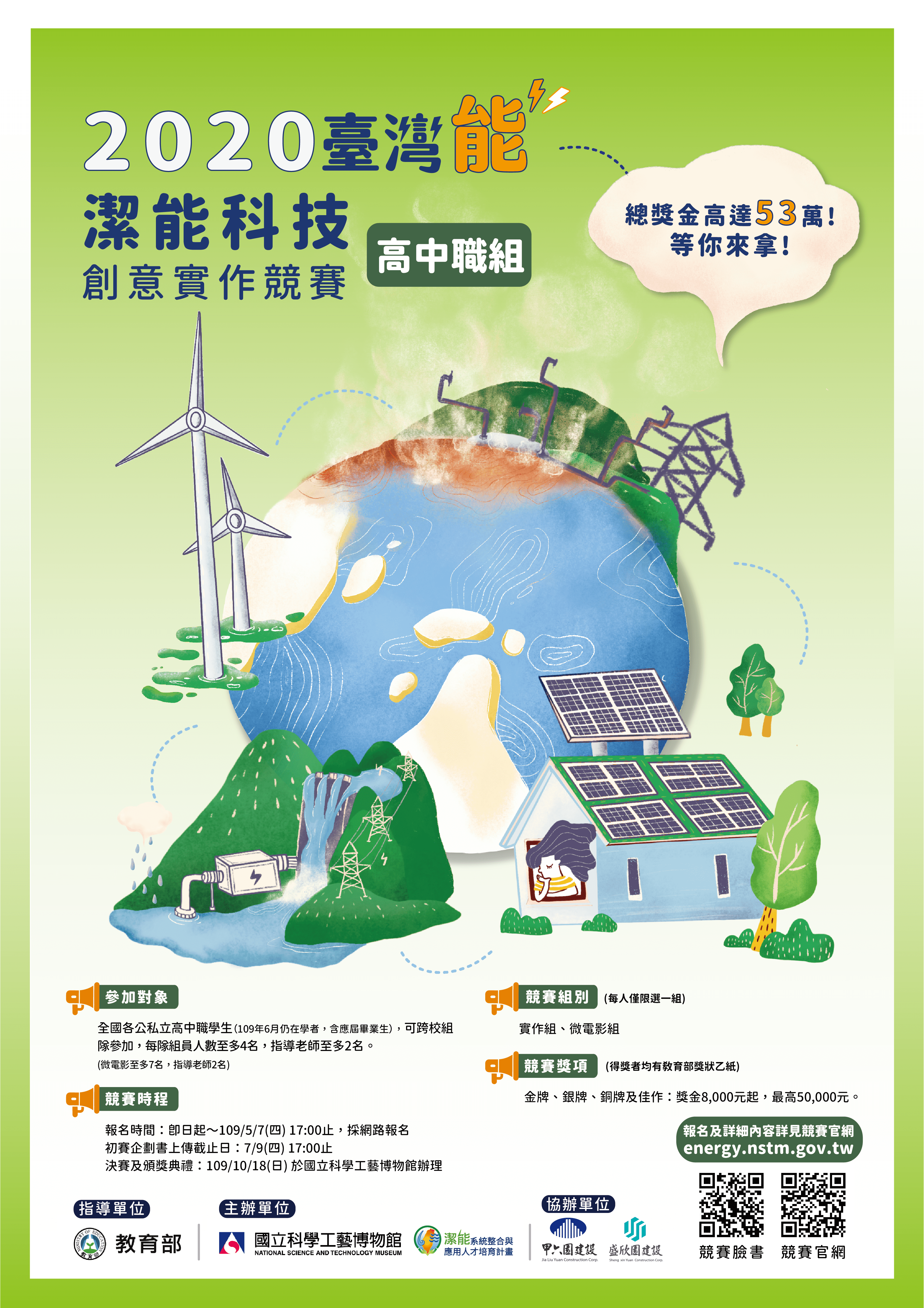 一、本競賽為教育部指導之全國性競賽,主要目的在於邀請全國各高中職學生參加以潔淨及創新能源、儲能、能源有效化利用、綠能循環經濟、節能等與「能源科技」相關之主題,實際參與創作設計,表達能源創意概念,期望能創造出新穎且創意性的作品,引導學生展開珍惜能源,愛護環境的行動。 二、本年度競賽分為「微電影組」及「實作組」,由參賽團隊擇一主題提出創意設計,可跨校組隊,優勝者將獲頒教育部獎狀、獎盃及獎金,最高獎金5萬元。 三、本競賽限網路報名,報名時間即日起至109年5月7日下午5時止,詳細競賽內容資訊請見網頁 http://energy.nstm.gov.tw。 四、檢附競賽辦法及競賽海報。 五、進一步訊息詳見附件說明。 ![]() ![]() 瀏覽數