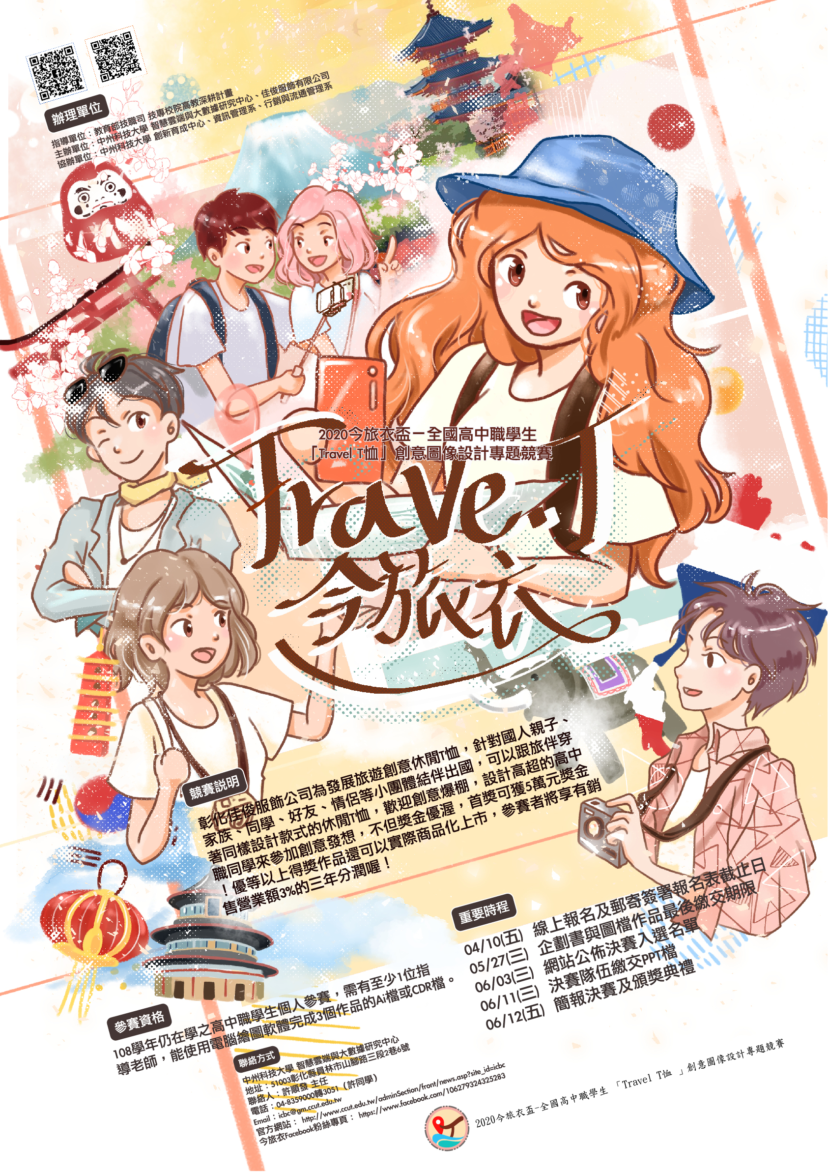 一、本專題競賽指導單位為教育部技職司(高教深耕計畫),主辦單位為中州科技大學與佳俊服飾開發有限公司產學合作共同舉辦,競賽要點、競賽海報及報名表電子檔各乙份,如附件。 二、本競賽目的在於培養未來對於旅遊產業與文化創意設計跨領域人才,提升學生創意思考與作品呈現能力,從作品競賽中互相觀摩學習,激盪出創意設計的火花,發掘出Travel.T恤設計創新與微創業模式。 三、本競賽備有豐厚獎金,首獎5萬元,並且有機會將自己的作品商品化上市及參與後續分潤,歡迎同學踴躍報名參加。 四、競賽聯絡窗口:本校智慧雲端與大數據研究中心許順發主任,聯絡電話04-8359000分機3051,Email:icbc@gm.ccut.edu.tw,競賽facebook官方粉絲專頁https://www.facebook.com/106279324325283/。 ![]() ![]() 瀏覽數