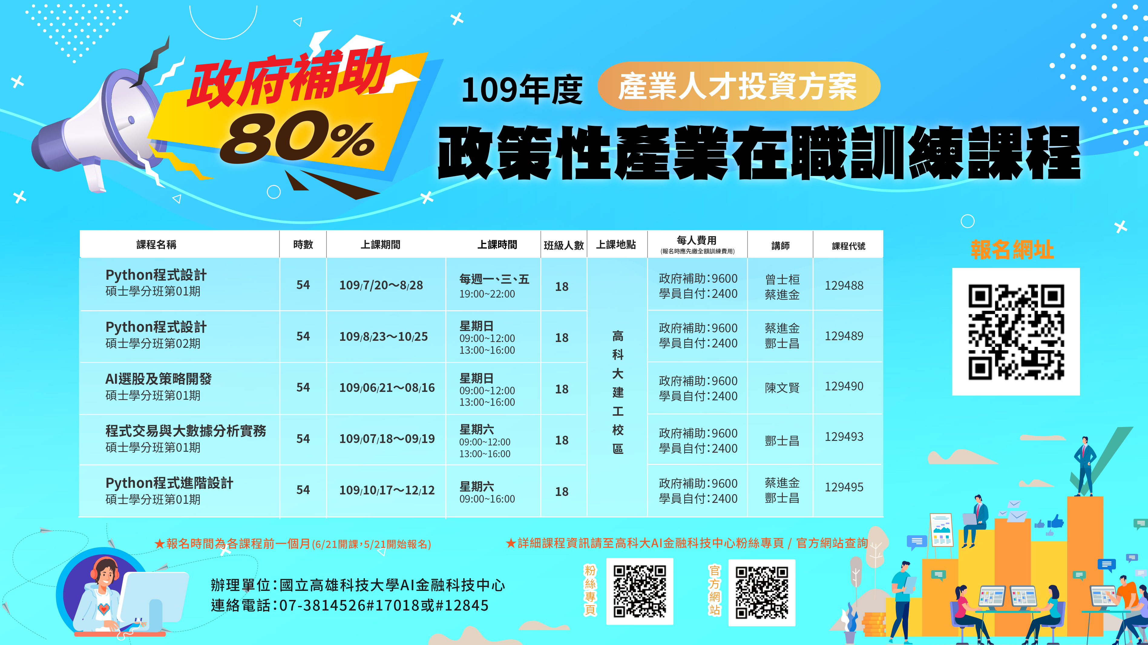 一、本次共辦理五門碩士學分班課程,政府補助80%以上學費,歡迎有興趣的師生共同來參加! 二、課程有Python初階、Python進階、AI選股與策略、程式交易與大數據分析實務,想學習的人千萬別錯過! 三、課程於開課日前一個月中午十二點開放報名,請至https://ojt.wda.gov.tw/ClassSearch報名,若有意報名也可以先填預報名表單(我們會在開始報名前通知您報):https://forms.gle/EzSECXtR3tYvYQzi8 四、連絡電話:07-3814526#17018 ![]() 瀏覽數