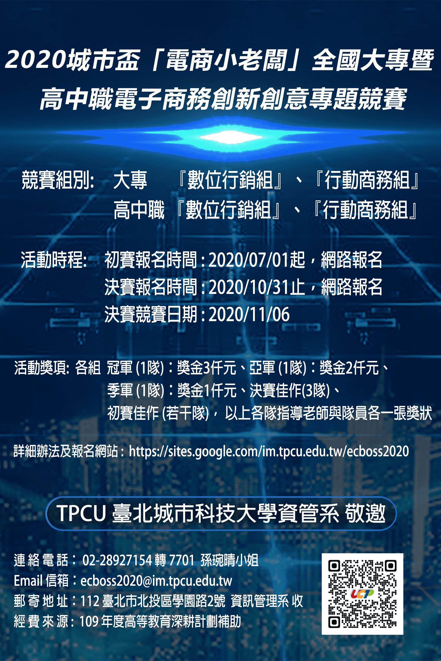 一、為訓練學生具備產品發表及網路行銷之能力,策辦「2020城市盃電商小老闆全國大專暨高中職電子商務專題競賽」,以增進學生專題製作能力,並藉以促進技專校院與高中職學校之交流互動,特舉辦此競賽,敬請貴校教師指導學生踴躍參與。 二、競賽活動將於2020年7月1日開始報名,初賽入圍者將於11月6日,假本校財經大樓2樓國際會議廳進行決賽,活動計畫書如附件一。 三、競賽官方網站:https://sites.google.com/im.tpcu.edu.tw/ecboss2020/ 四、聯絡電子信箱:ecboss2020@im.tpcu.edu.tw ![]() ![]() 瀏覽數