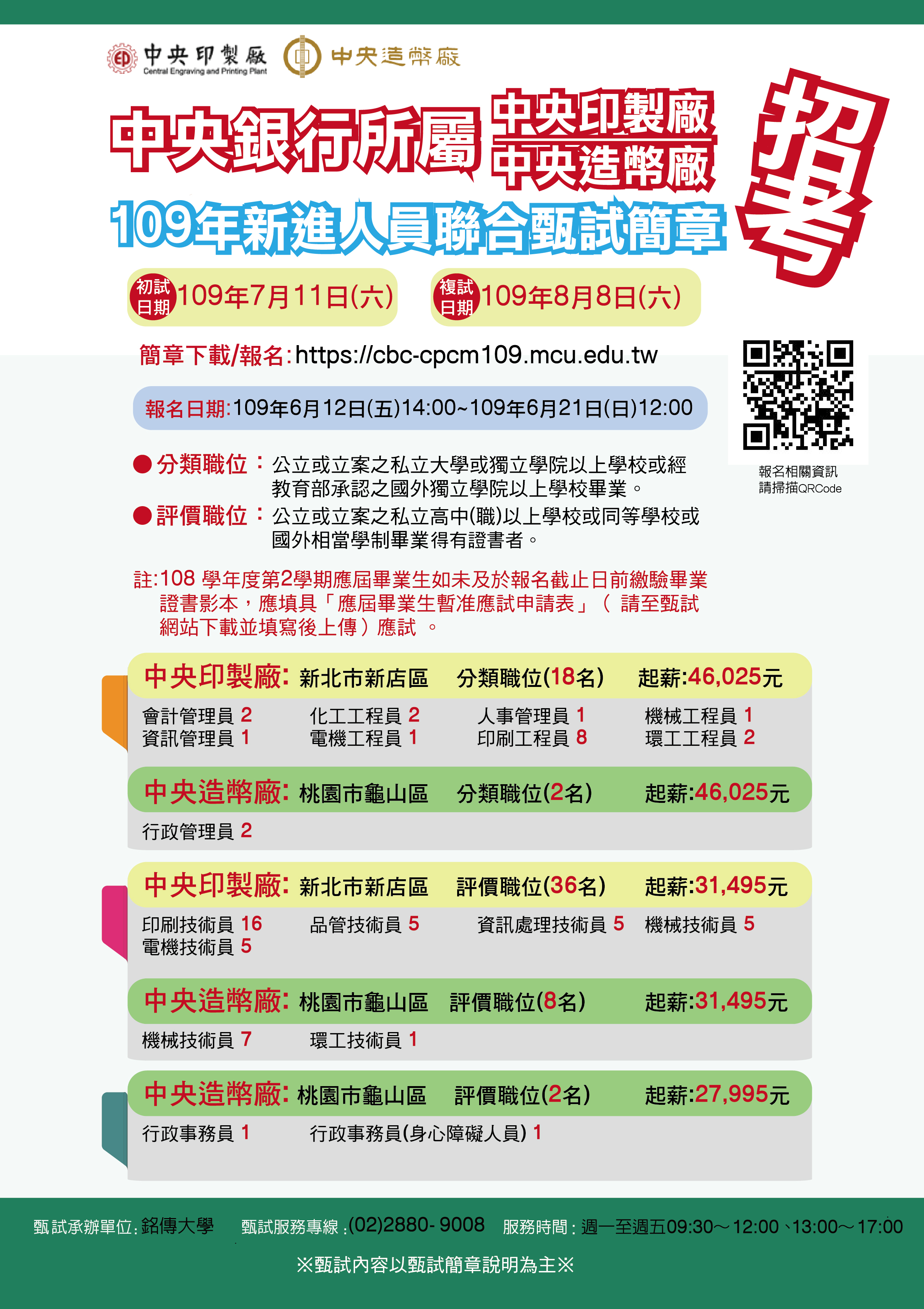 轉知銘傳大學辦理中央銀行所屬中央印製廠、中央造幣廠109年新進人員聯合甄試訊息