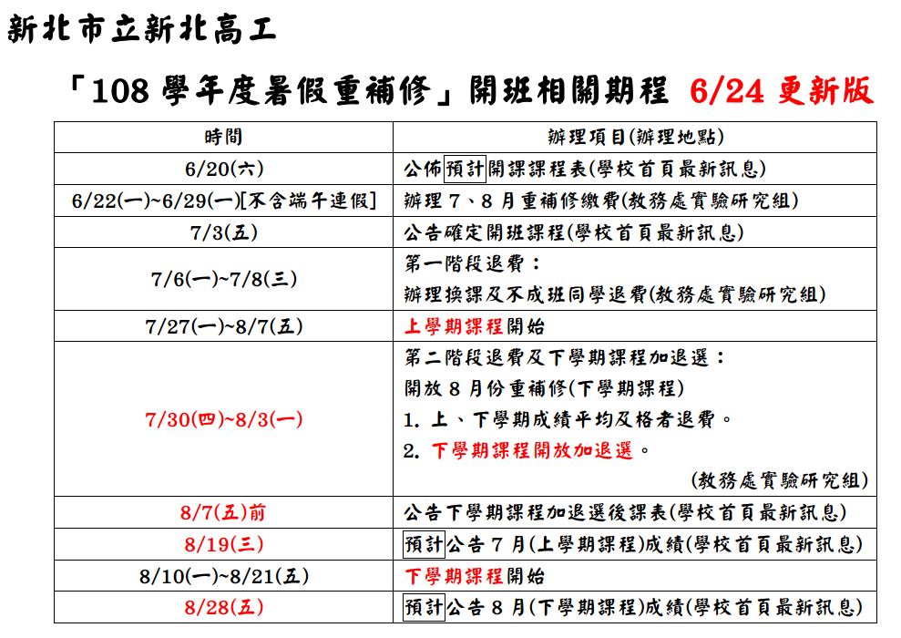 【重要公告】108學年度暑假重補修報名相關事項_期程0624更新版
