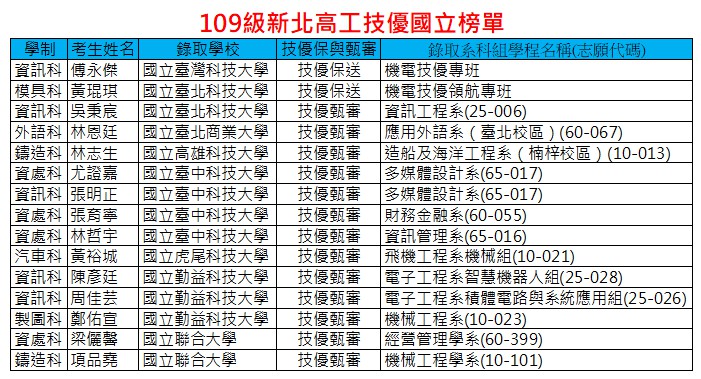 109級新北高工技優國立榜單
