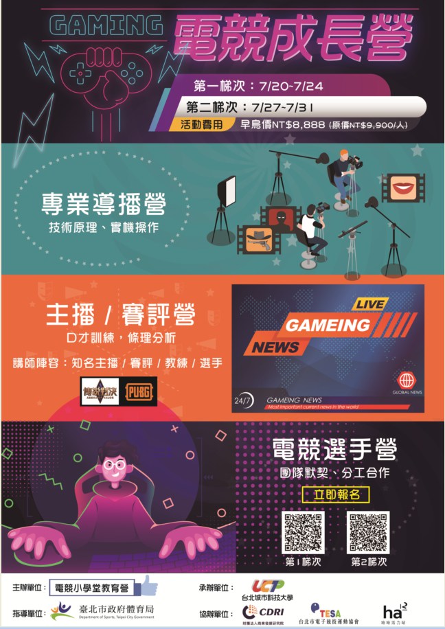 一、活動對象:暑假後升五年級至高中三年級學生。 二、活動人數:60人額滿(採5人小班制體驗)。 三、活動時間:(上課時間為每日09:00-18:00) (一)第一梯次:109年7月20日(一)至7月24日(五)。 (二)第二梯次:109年7月27日(一)至7月31日(五)。 四、活動地點:台北市士林哈哈活力站(臺北市士林區文林路102號地下2樓)。 五、報名方式:為收費活動,採網路報名至109年07月10日截止,詳洽官網 (https://www.facebook.com/ECampTW/)。 六、檢送電競成長營宣傳海報。 七、若有其他相關問題請聯絡主辦單位王小姐,02-2883-0801 (週一至週五10:00-19:00)。 ![]() 瀏覽數