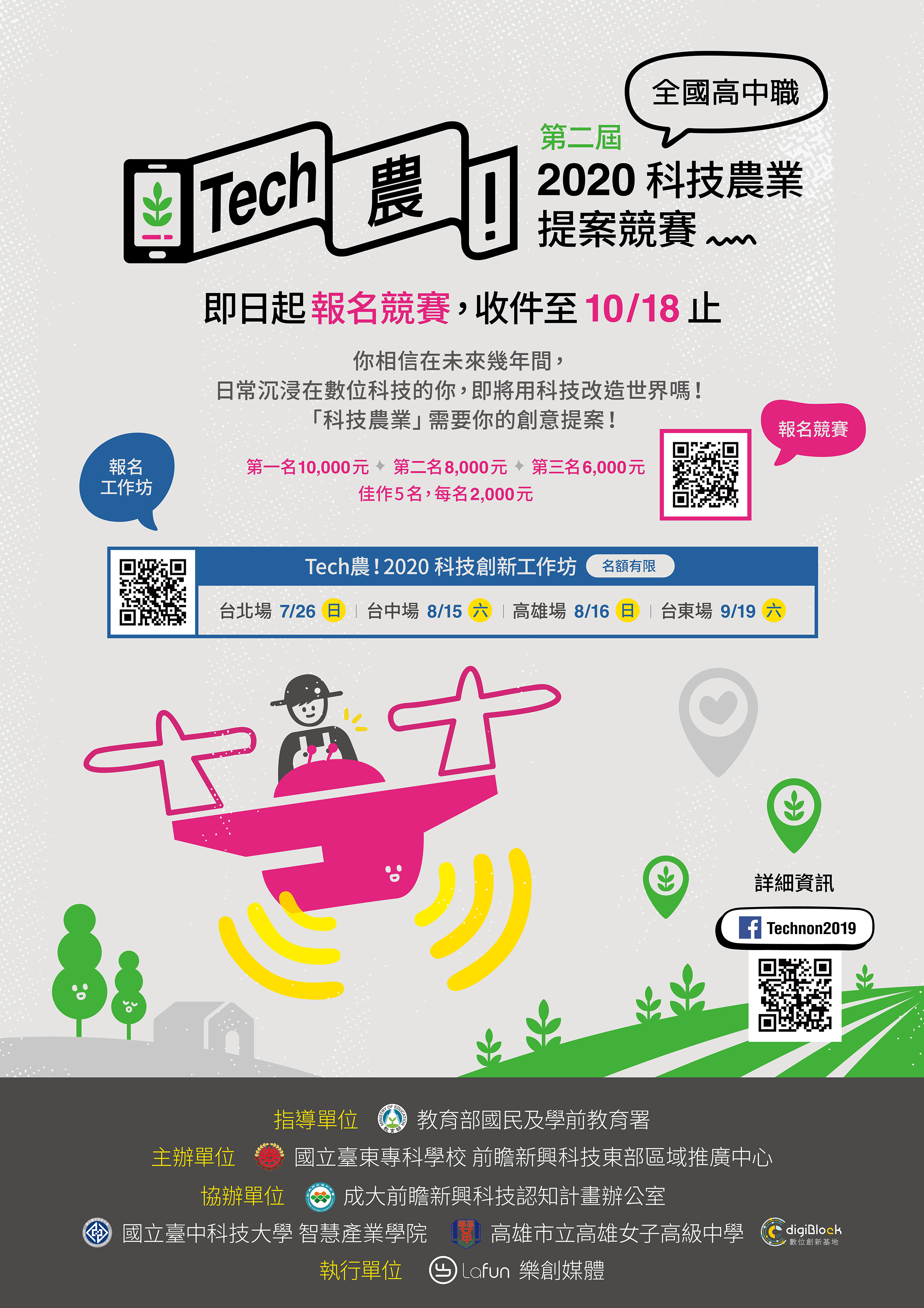一、活動資訊如下: (一)針對本競賽,將於全國辦理四場科技創新工作坊《Tech農!2020 科技創新工作坊》,分別為臺北場、臺中場、高雄場以及臺東場。即日起開放報名,各場次人數有限,額滿為止。 (二)競賽參與方式:即日起進行報名,並同時上傳企劃書與說明影片(網址:https://forms.gle/6YmpSbUUsBapL1F38);將於109年10月23日公佈成績與獲獎名次,參賽證明與獎項內容將郵寄掛號寄出至所屬學校之指導老師。 (三)聯絡方式:新興科技東部區域推廣中心胡助理,電話:089-226389#2795。