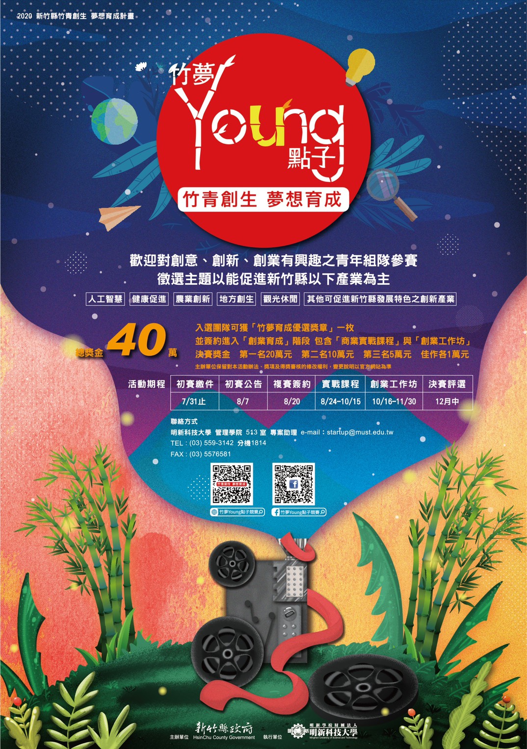 一、為鼓勵國人深入瞭解新竹縣特色產業,並輔導各地優秀青年將創意具體實現,進而產生創業經濟價值;本校受新竹縣政府委託,將於8月20日舉辦「2020年新竹縣竹青創生夢想育成計畫-竹夢Young點子」競賽,總獎金合計新臺幣40萬元。透過辦理競賽方式,持續發掘有潛力之優秀團隊,以創意、創新、創業模式共同提升新竹縣特色產業,並推廣至全國各地。 (一)初賽繳件:即日起至109年7月31日止。 (二)初賽公告:109年8月7日。 (三)複賽簽約:109年8月20日。 (四)實戰課程:109年8月24日至109年10月15日。 (五)創業工作坊:109年10月16日至109年11月30日。 (六)決賽評選:109年12月中。 二、檢附「2020年新竹縣竹青創生夢想育成計畫-竹夢Young點子」競賽海報1份,如有任何問題,請參照新竹縣政府青年事務中心官網及本活動之粉絲專頁;或來電(03)559-3142轉1814洽陳小姐。 ![]() ![]() 瀏覽數