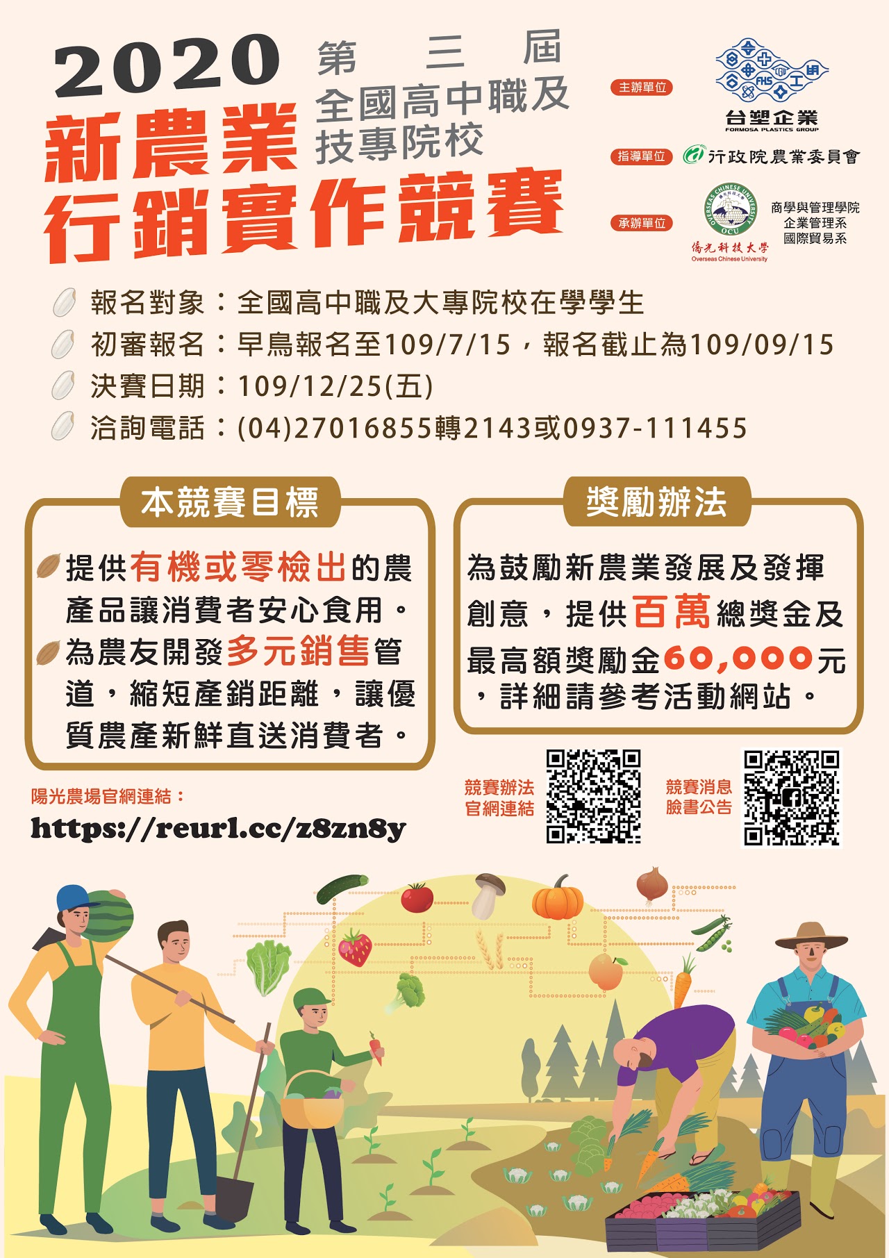 一、本校承辦由台塑企業委託之「第三屆全國高中職及技專院校新農業行銷實作競賽」,為推廣並讓更多人認識競賽,謹訂於109年8月26日(三)舉辦競賽說明會。 二、說明會報名資格: (一)初審合格隊伍者,請全組參加或至少一名成員參加。 (二)有意參加競賽者,請全組參加或至少一名成員參加。 三、說明會報名網址:https://reurl.cc/qd9NWq 四、說明會報名截止時間為109年8月24日(一)上午10:00(或額滿即關閉) 五、競賽專頁:https://reurl.cc/Oq7X6y 六、競賽報名截止時間:109年9月15日(二) 七、競賽聯絡專線:04-27016855分機2143 或0937-111-455 八、競賽聯絡信箱:vegetable@ocu.edu.tw 九、競賽承辦單位:僑光科技大學 商業與管理學院、企業管理系、國際貿易系 ![]() ![]() 瀏覽數