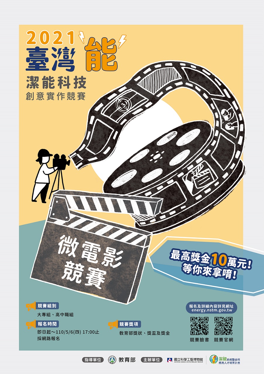 說明: 一、本競賽為教育部指導之全國性競賽,主要目的在於邀請全國各高中職學生參加以潔淨及創新能源、儲能、能源有效化利用、綠能循環經濟、節能等與「能源科技」相關之主題,實際參與創作設計,表達能源創意概念,期望能創造出新穎且具創意性的作品,引導學生展開珍惜能源,愛護環境的行動。 二、本年度競賽分為「微電影組」及「實作組」,由參賽團隊擇一主題提出創意設計,可跨校組隊,優勝者將獲頒教育部獎狀、獎盃及獎金,獎金最高5萬元。 三、本競賽限網路報名,報名時間即日起至110年5月6日下午5時止,詳細競賽資訊請見網頁https://energy.nstm.gov.tw。 ![]() ![]() 瀏覽數