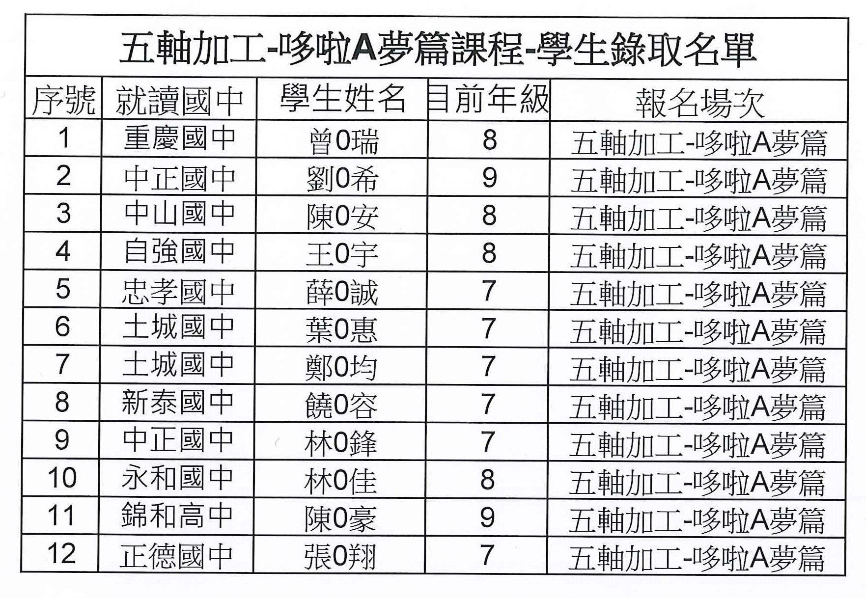公告-五軸加工 哆啦A夢篇學生錄取名單
