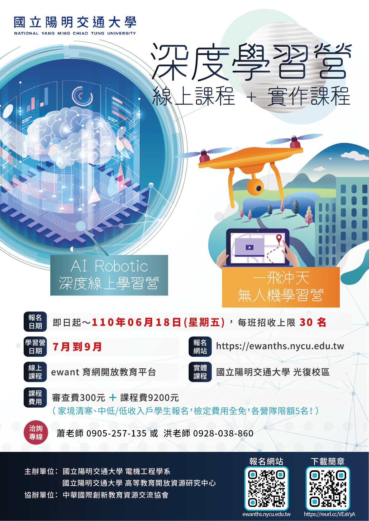 轉知:國立陽明交通大學與中華國際創新教育資源交流協會辦理「2021國立陽明交通大學AI Robotic深度線上學習營」內容與資訊說明。