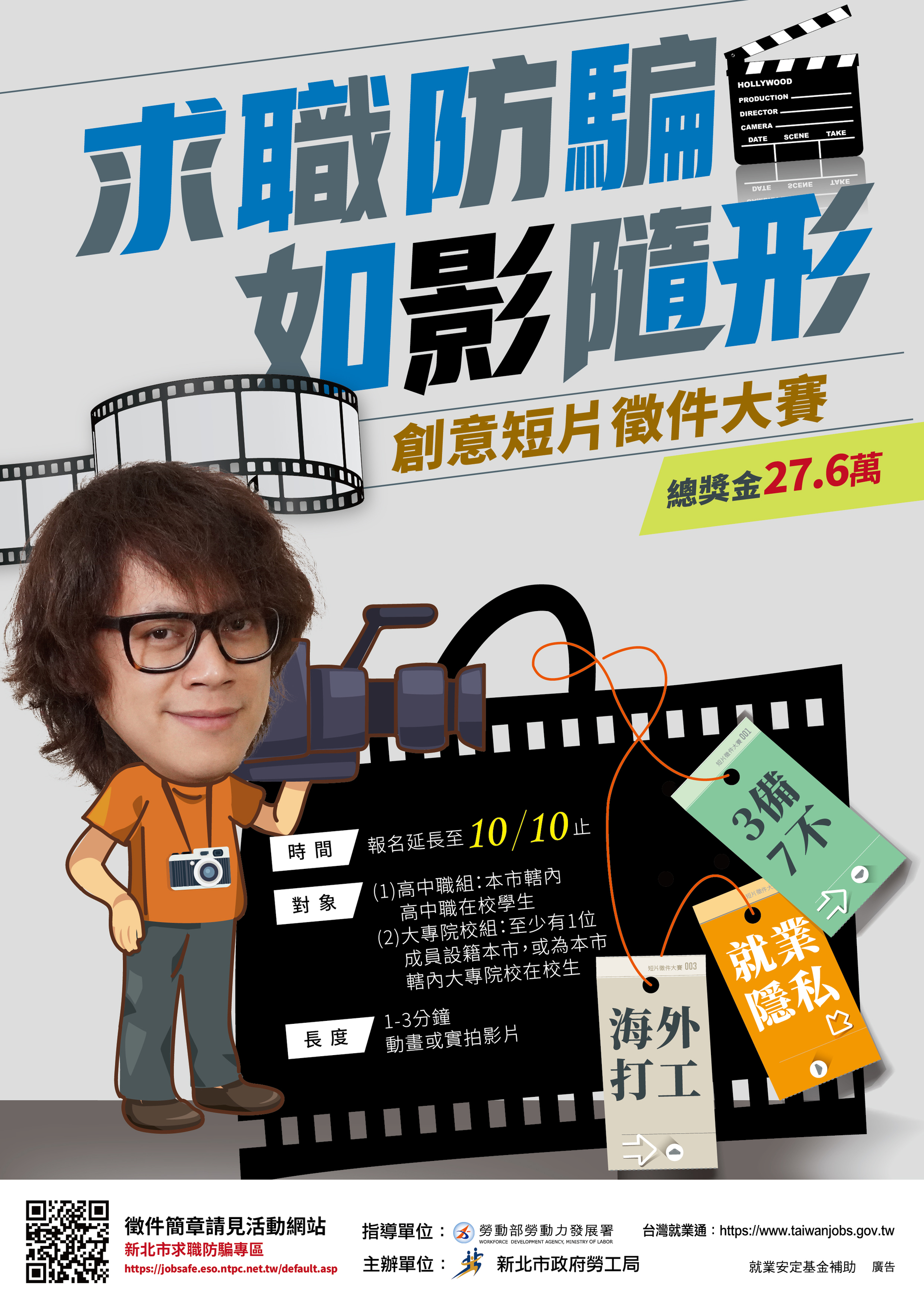 二、旨揭活動報名至10月10日止,總獎金高達27.6萬元!相關訊息及拍攝素材請上本局求職防騙宣導專區(網址:https://jobsafe.eso.ntpc.net.tw)查詢;或請洽報名專線:(02)8787-1111#8235陳先生。