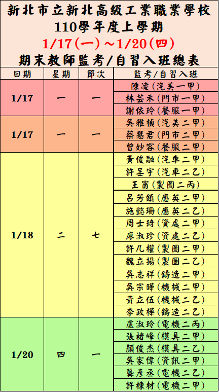 3.教師監考、自習入班總表請查閱附件。