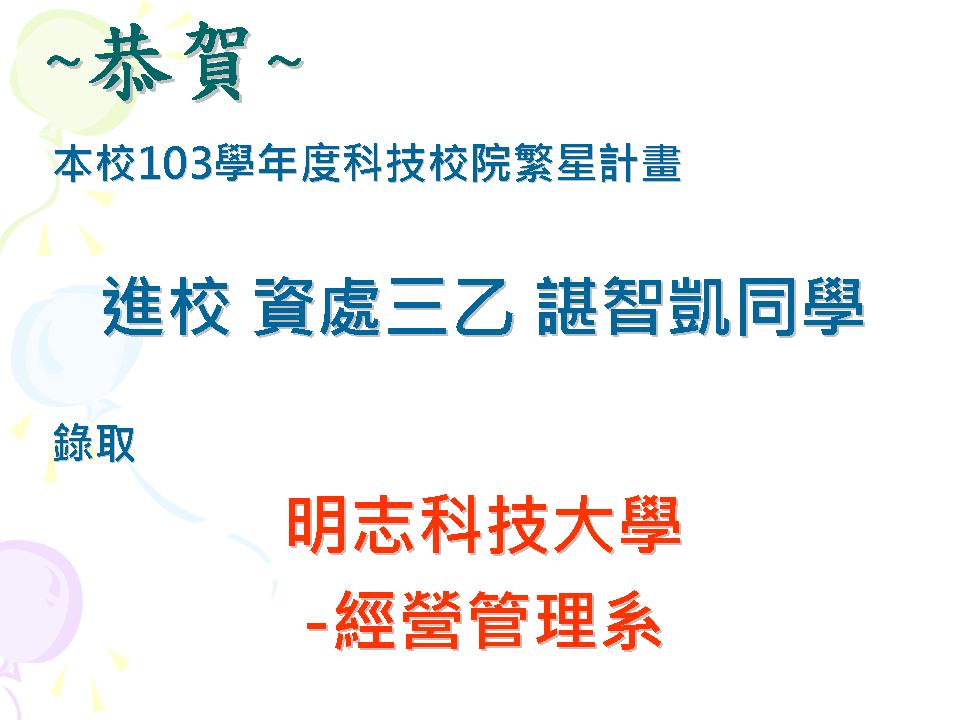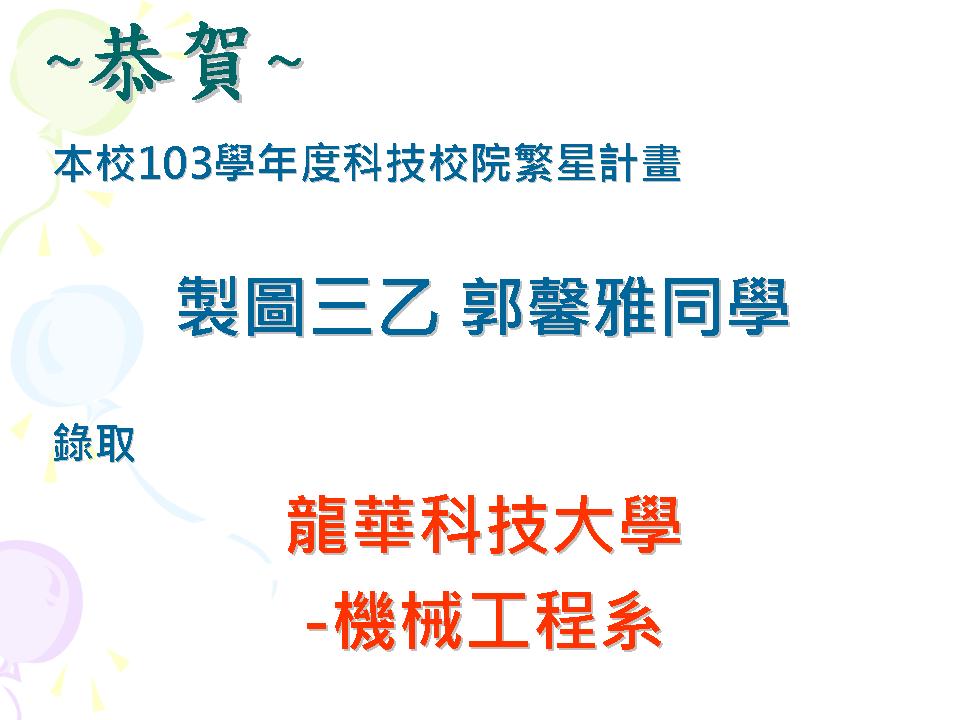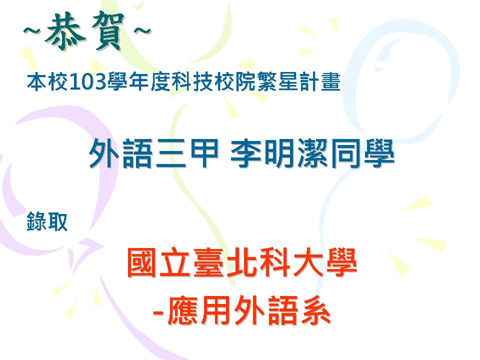 恭賀本校103學年度科技校院繁星計畫聯合推薦甄選錄取名單