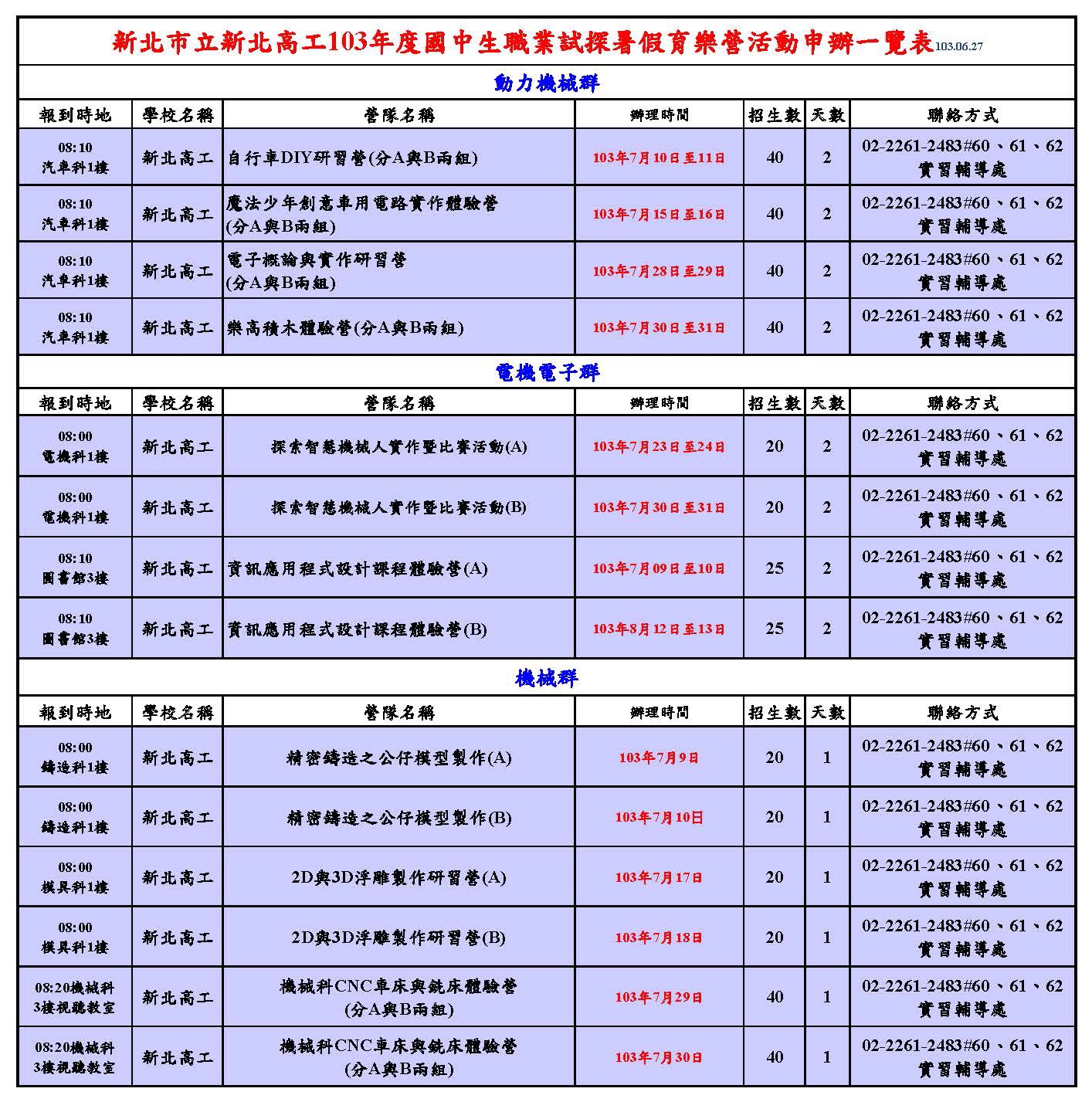 請參加暑假育樂營國中生一律著該校校服或體育服 謝謝配合!103.06.27 |
