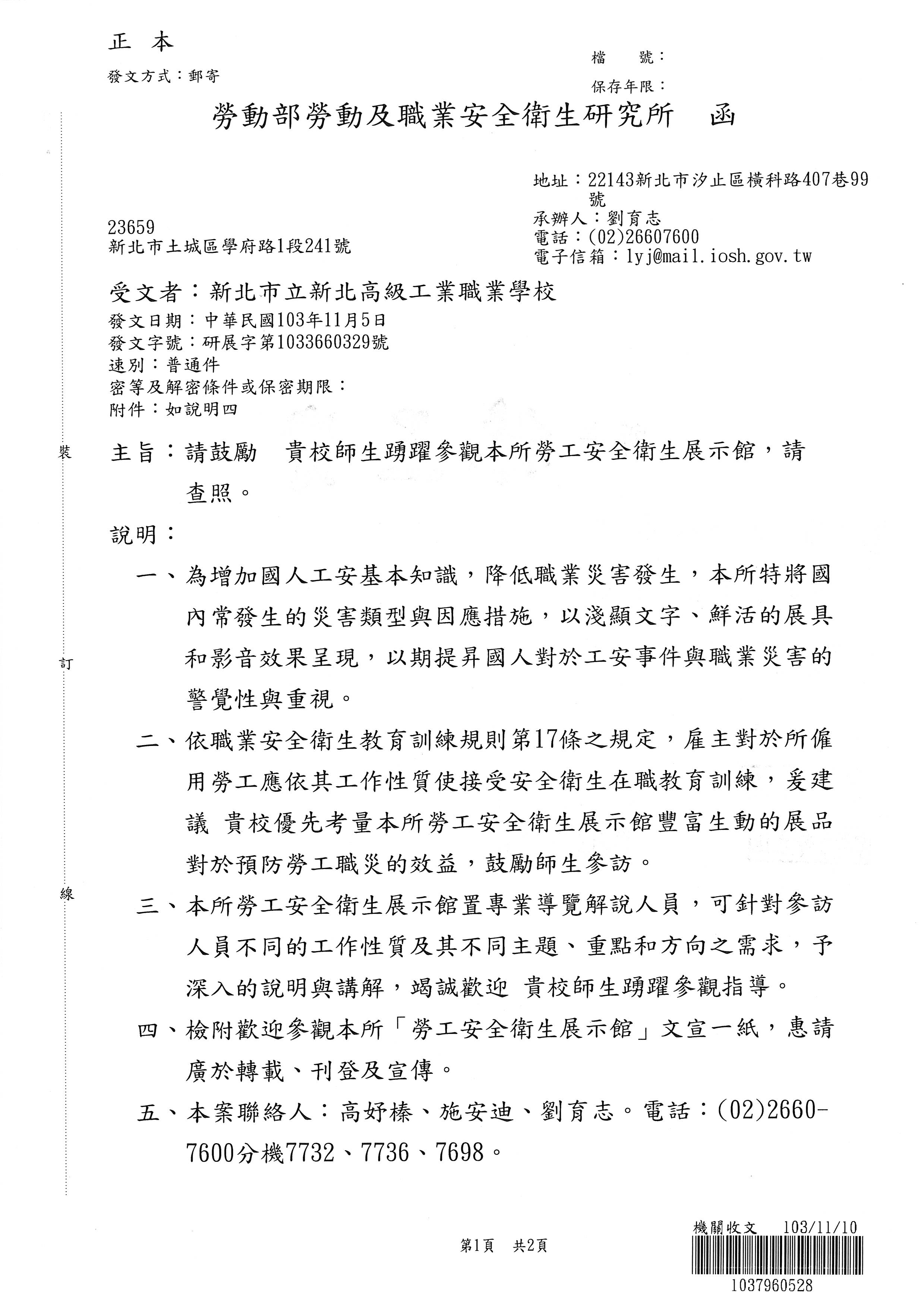 轉知勞動部勞動及職業安全衛生研究所相關訊息。
