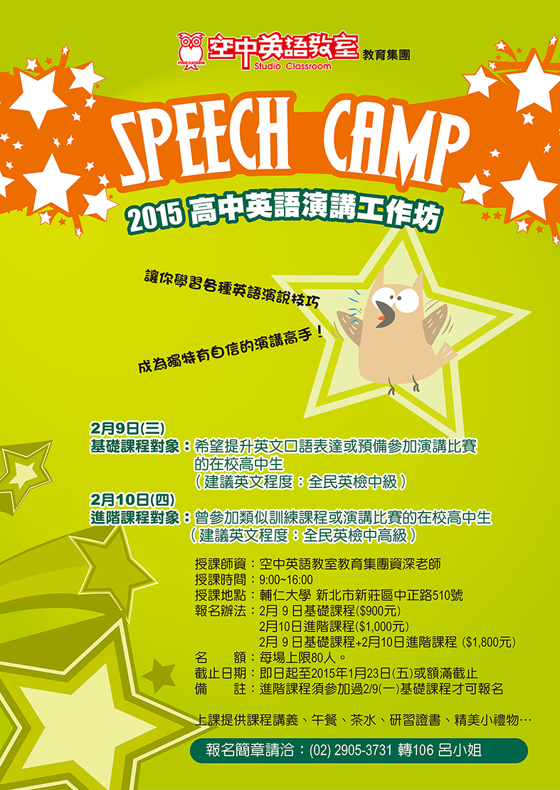 轉知2015年高中英語演講工作坊(寒假)招生資訊