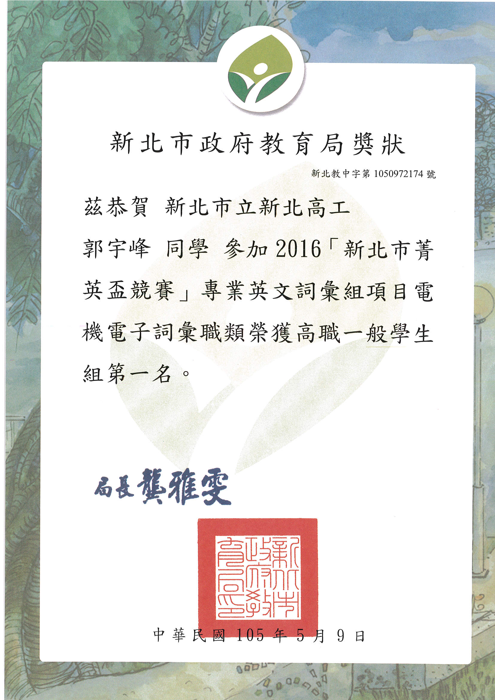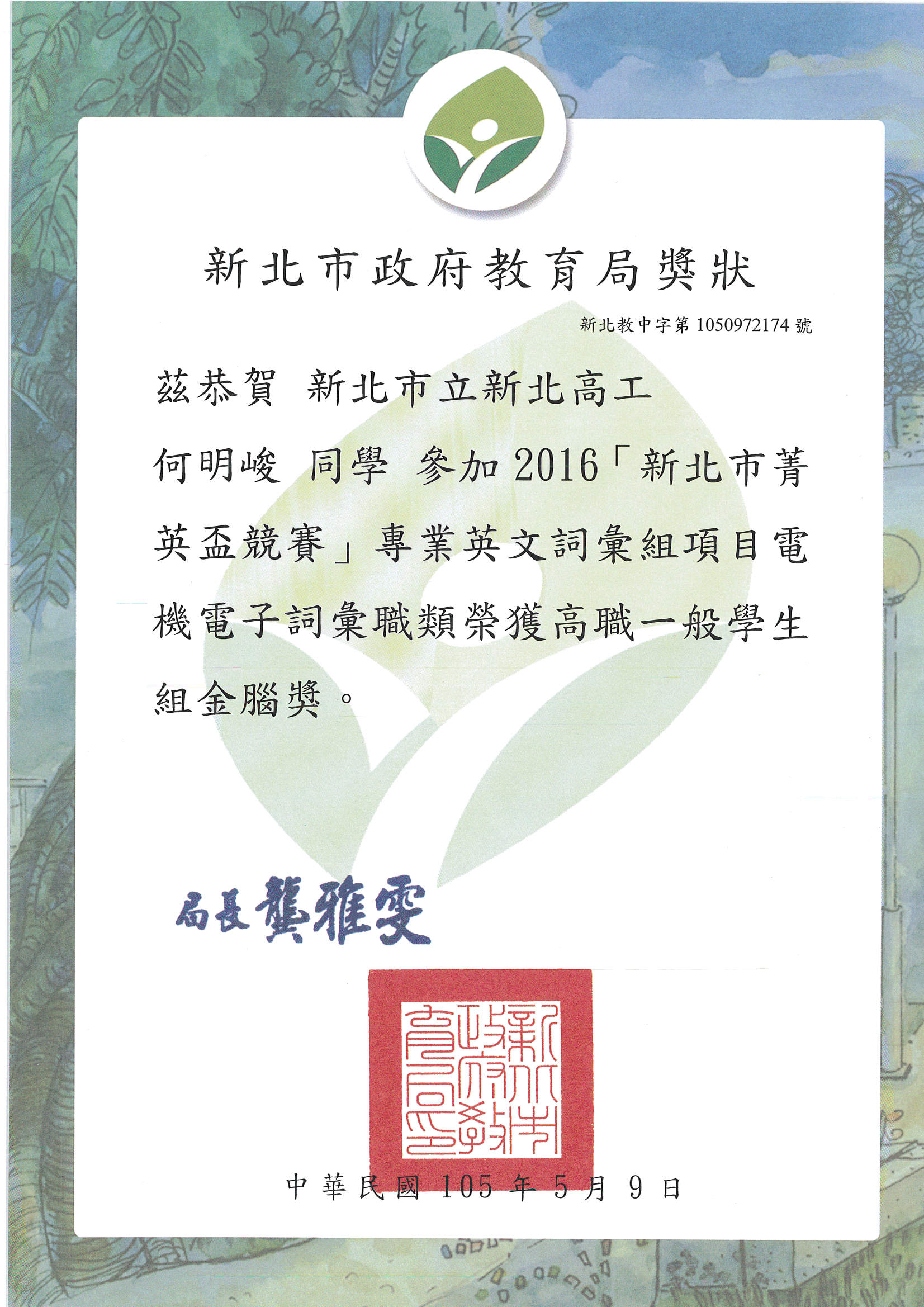 賀 資訊科學生榮獲 2016新北市專業英文電子電機群組 第1名