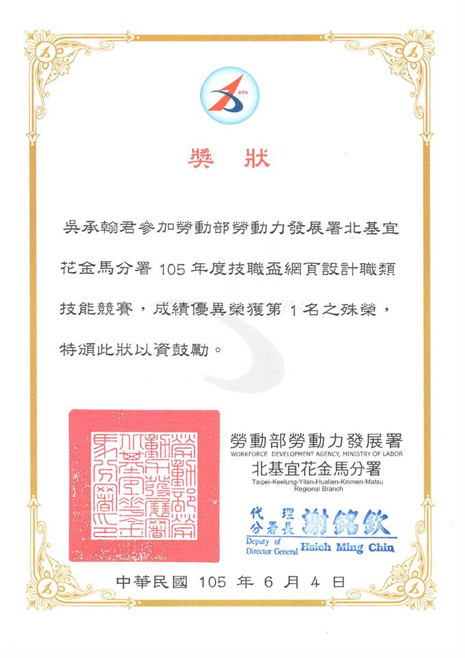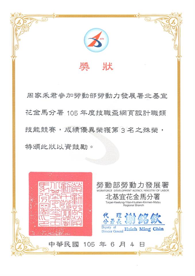 105年度勞動部技職盃技能競賽【網頁設計】榮獲佳績