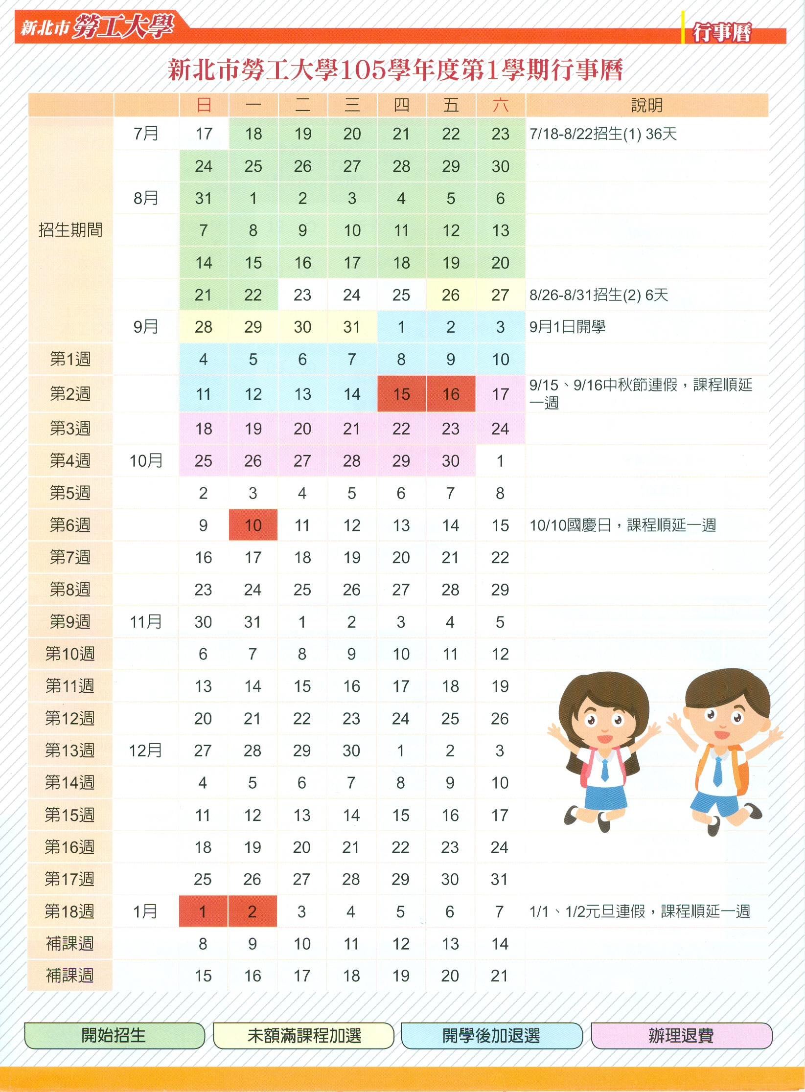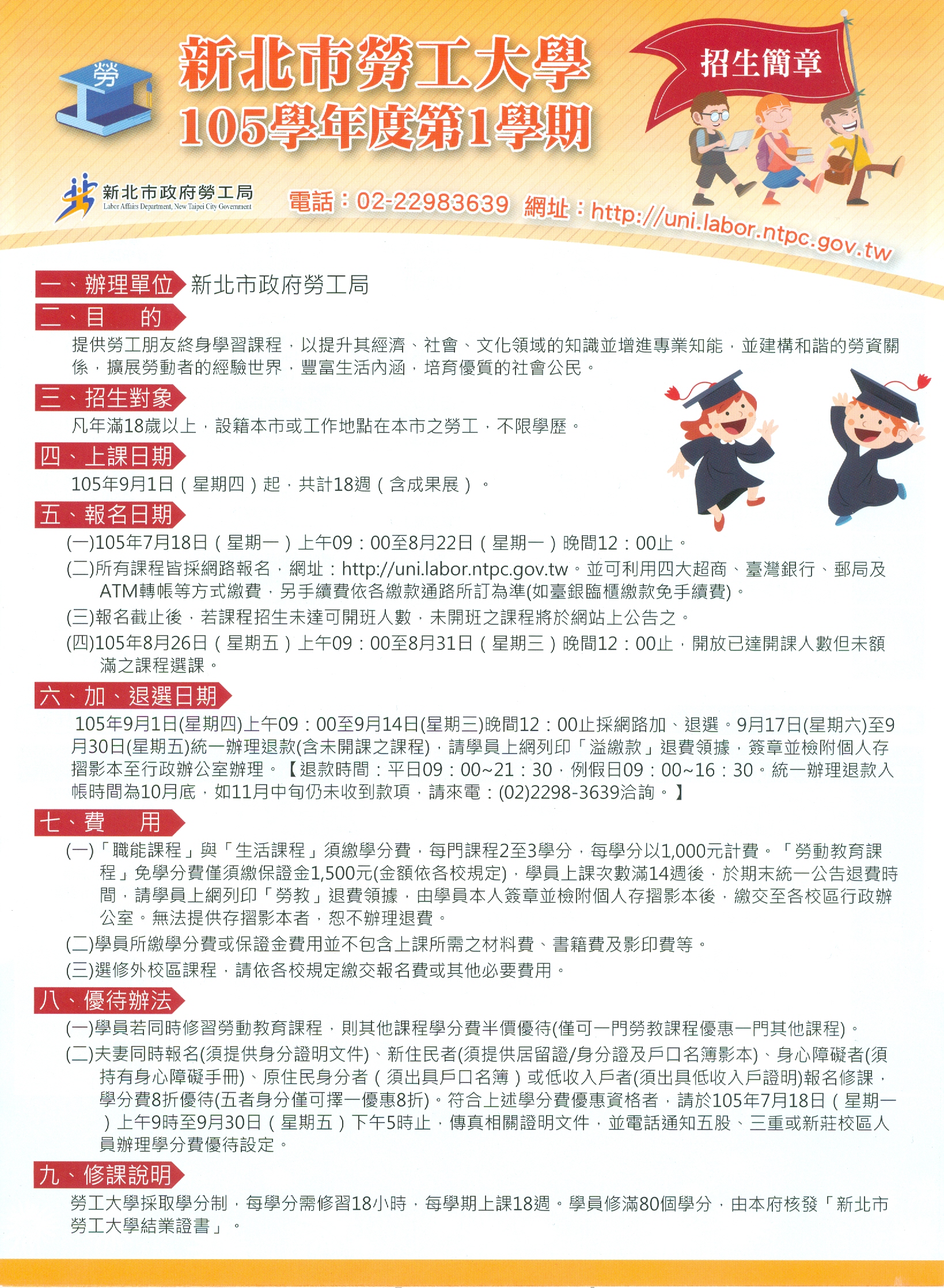 105-1新北市勞工大學-招生訊息 報名日期: (一)105年7月18日(星期一)上午09:00至8月22日(星期一)晚間12:00止。 上課日期: (二)105年 9月1日(星期四 )起,共 計 18 週(含成果展)。 (三)所有課程皆採網路報名,網址:http://uni.labor.ntpc.gov.tw。並可利用四大超商、臺灣銀行、郵局及ATM轉帳等方式繳費,另手續費依各繳款通路所訂為準(如臺銀臨櫃繳款免手續費)。 (四)新北市勞工大學 (五)招生簡章