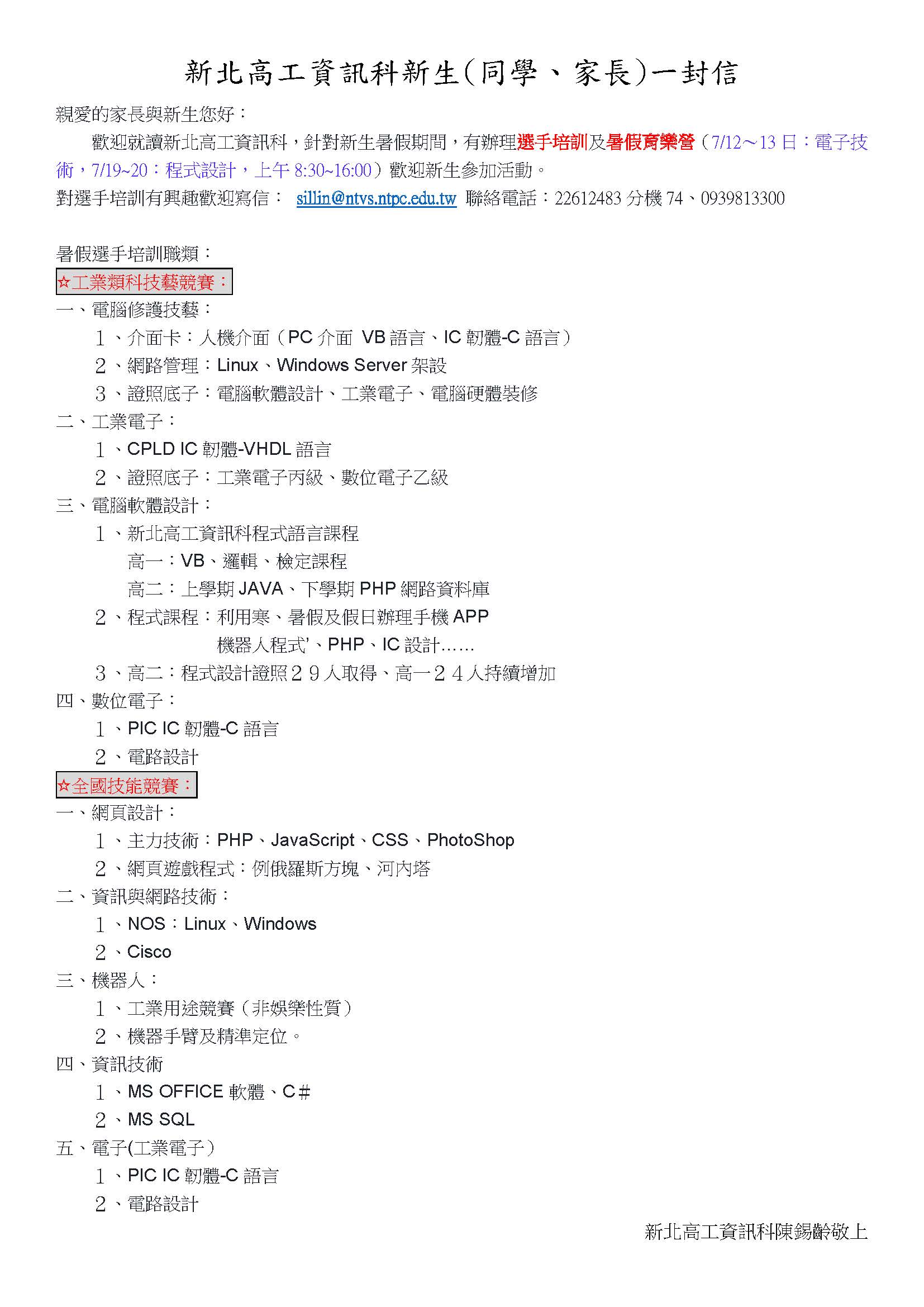新北高工資訊科新生(同學、家長)一封信
