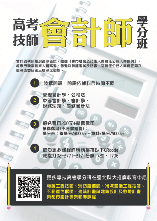 轉知國立臺北科技大學推廣教育中心開設專技高考「會計師」學分班,即日起開始招生,請並鼓勵有興趣人士報名參加。
