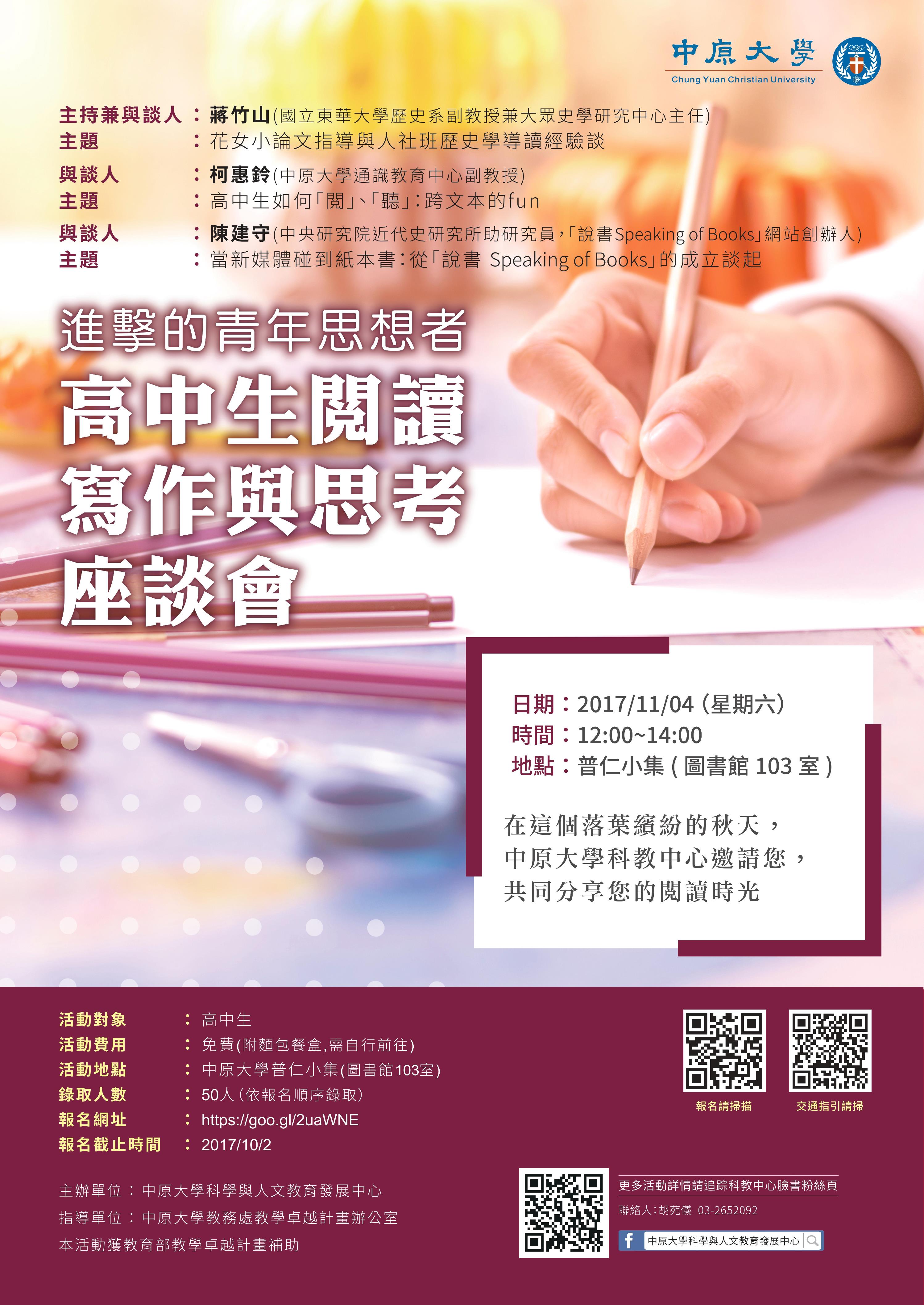 活動內容:邀請知名作家與學者,以座談會形式帶領學生一起探索閱讀的樂趣。 活動對象:高中(職)生。 活動日期:106年11月4日(星期六)。 活動時間:12時至14時(提供麵包餐盒)。 報到時間:11時40分至11時55分。 活動費用:免費。 活動地點:中原大學圖書館1樓普仁小集(圖書館103室)。 交通路線指引請參閱本校網址:http://www.cycu.edu.tw/map.html。 人數限制:50人(依報名順序錄取,額滿為止)。 報名網址:https://goo.gl/2uaWNE (錄取通知將於10月30日以電子郵件通知)。