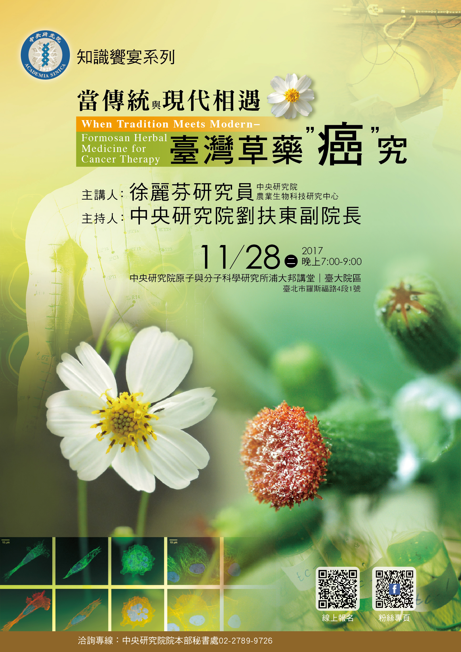 一、旨揭活動由劉扶東副院長主持,邀請本院農業生物科技研究中心徐麗芬研究員主講「當傳統與現代相遇—臺灣草藥”癌”究」(活動海報如附件)。時間:晚間7至9時,地點為本院原子與分子科學研究所浦大邦講堂(臺大院區)(臺北市羅斯福路4段1號)。